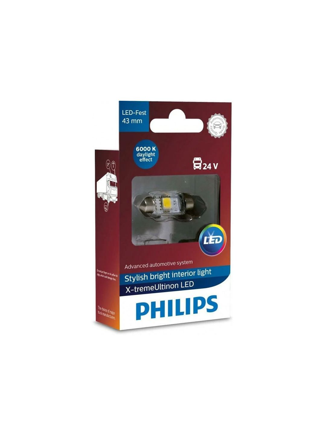 L'ampoule LED Philips X-tremeUltion Festoon 43 mm est conçue pour améliorer l'éclairage intérieur des camions, bus et véhicules industriels équipés d'un système électrique 24 V. Elle remplace les ampoules navette classiques et offre un éclairage plus lumineux, plus efficace et plus moderne.