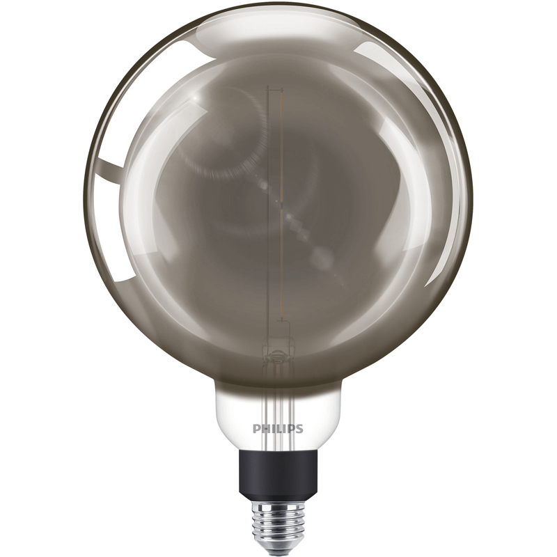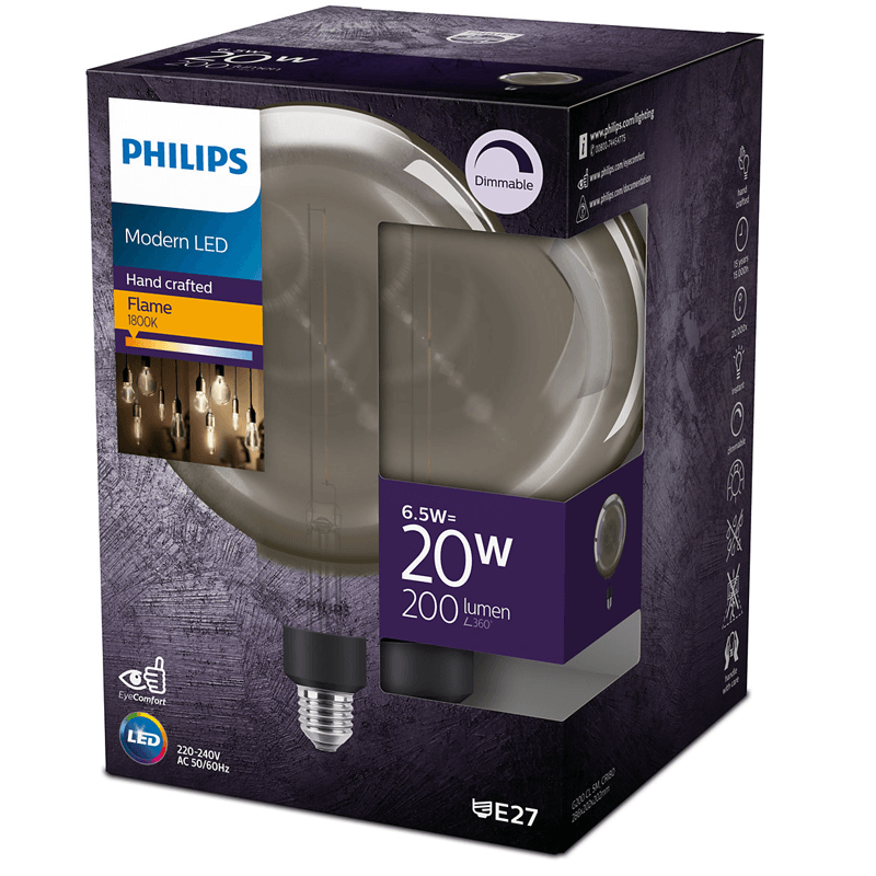 Ampoule LED géante G200 à large filetage E27 finition miroir de Philips, modèle Modern LED Smoky d'une puissance de 6,5W - 20W et d'une tonalité lumineuse chaude de 1800K, sa puissance lumineuse est de 200Lm et son efficacité énergétique est A+.