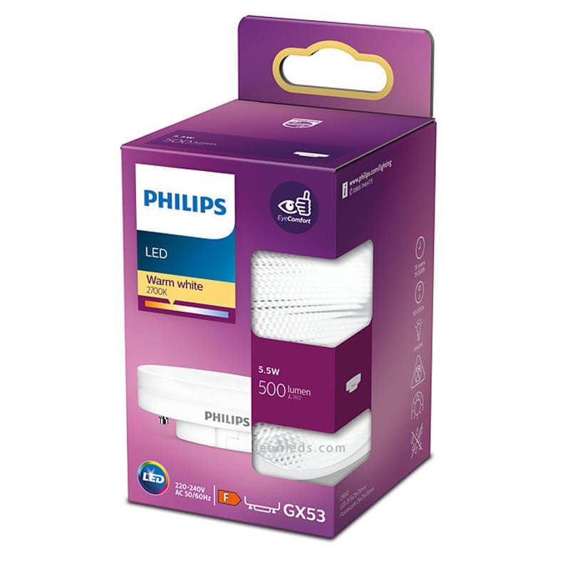 Ampoule LED avec culot GX53 de la marque Philips d'une puissance de 5,5W, ampoule Plug And Play, vous n'avez besoin d'effectuer aucune modification pour remplacer votre ancienne ampoule à incandescence par cette ampoule LED.
