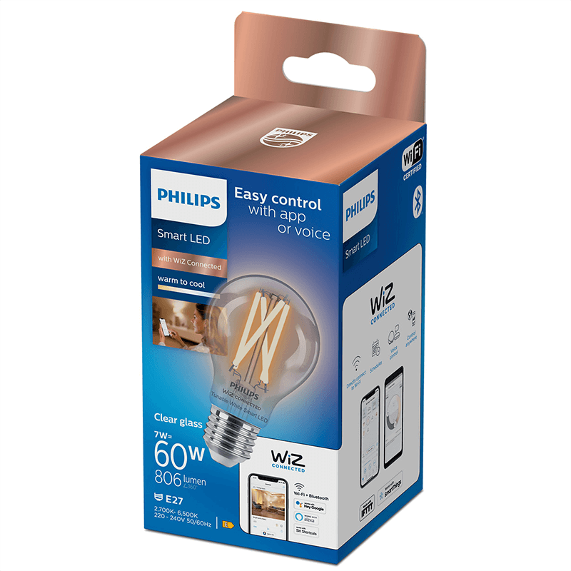 Avec cette lumière LED intelligente, vous pouvez atténuer les lumières au niveau de luminosité souhaité avec votre smartphone, la WiZmote ou votre voix. La lampe LED intelligente à filament transparent offre une durée de vie de 15 000 heures et 20 000 cycles d'arrêt, en plus de la garantie de deux ans fournie avec le produit.