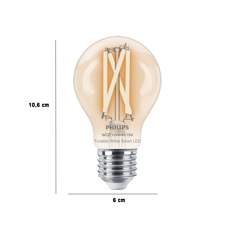 Si vous souhaitez donner à votre maison une lumière intelligente au look vintage, vous pouvez y parvenir en achetant l' ampoule à filament Philips Smart LED avec un culot E27, 7W équivalent à 60W, qui offre une lumière dimmable de blanc chaud ou froid . Concernant les mesures, nous soulignons une hauteur de 10,6 cm et une largeur de 6 cm, avec un poids de 0,042 kg.