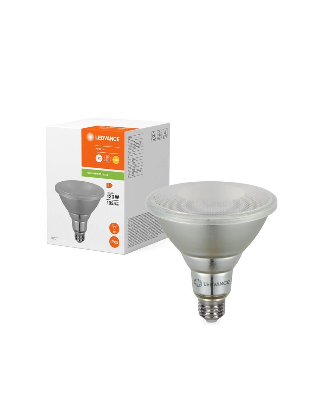 Ampoule LED PAR38 LedVance Performance Class d'une puissance de 13,5W équivalente à plus de 120W, une intensité de 1035Lm (11 000cd) et un ton lumineux chaud de 2700K. Ampoule LED valable pour une installation en extérieur, IP65 et un angle de faisceau lumineux de 15º, Gamme Performance avec 4 ans de garantie et 25 000 heures de durée de vie utile.