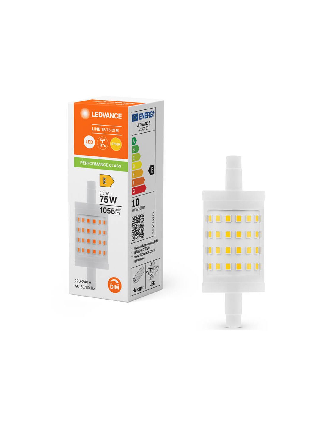 L' Ampoule Linéaire Dimmable R7S 78mm de la marque LedVance a une puissance de 9,5W et une couleur de lumière de 2700K (Blanc Chaud). Son intensité lumineuse est réglable avec une puissance de 1055Lm.
