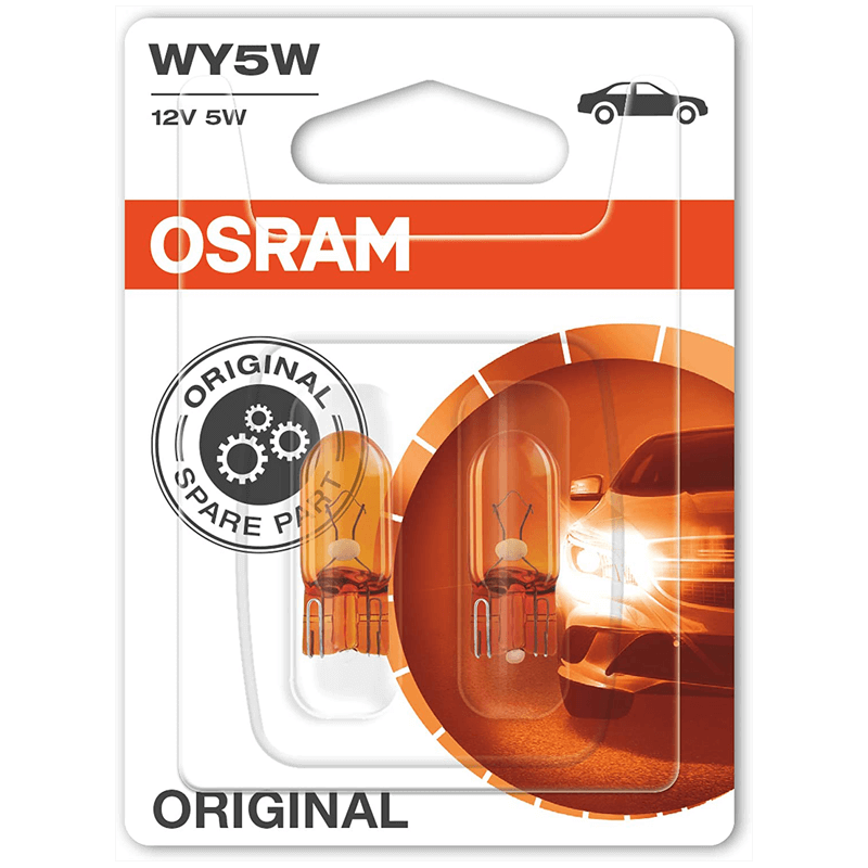 Blister de 2 Ampoules Halogènes WY5W ambrées (W2,1x9,5d) de la gamme Original de la marque Osram pour Véhicules 12V d'une puissance de 5W, ampoule sans douille à utiliser pour les clignotants, verre ambré.