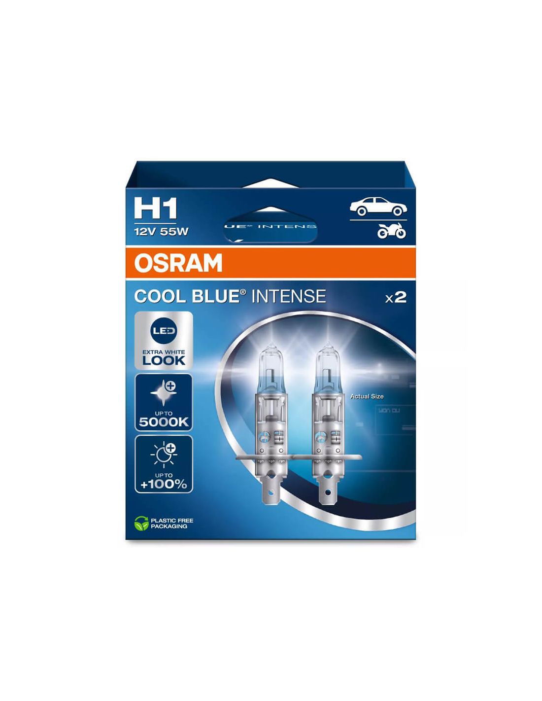 Les nouvelles ampoules de voiture Osram Cool Blue Intense (Next Generation) pour le feu antibrouillard principal ou avant de la voiture offrent une lumière blanche de 5000K et une intensité lumineuse 100% plus lumineuse qu'une ampoule classique. Ils se démarquent de leurs concurrents par leur durée de vie supérieure, leur 100% de lumière en plus et une lumière blanche intense, en lumière longue portée elle offre 1550 ± 15 Lm.
