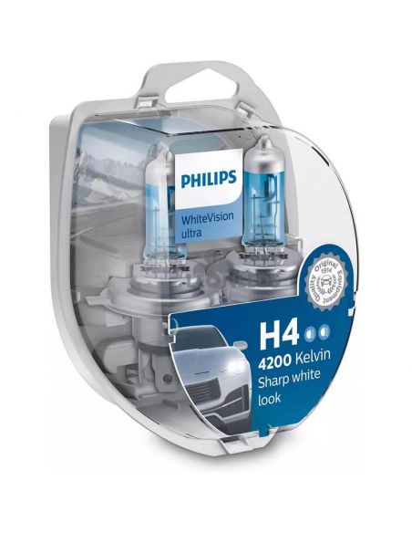 Les nouvelles ampoules de voiture H4 Philips H4 lumière plus blanche Whitevision Ultra pour le feu antibrouillard principal ou avant de la voiture offre une intensité de lumière blanche et 60% de lumière en plus qu'une ampoule classique. Ils se démarquent de leurs concurrents par leur durée de vie supérieure, leur 60% de lumière en plus et une lumière blanche intense, en lumière longue portée il offre 1560Lm+- 10% et en faisceau court 960Lm+- 10%.