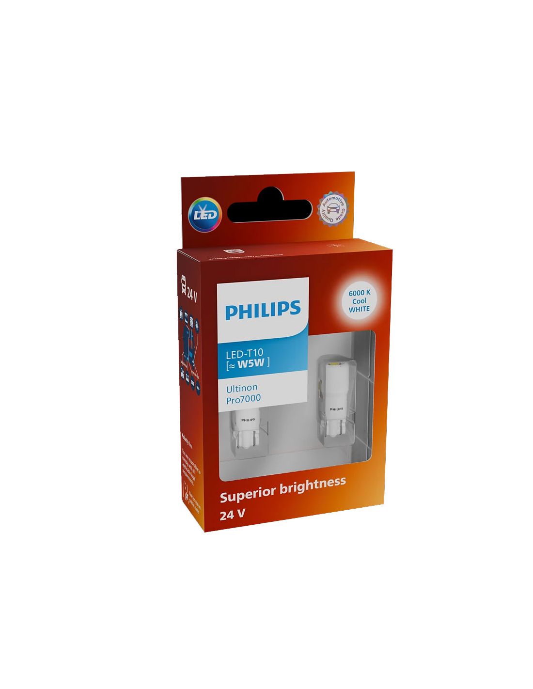 Le Philips Ultinon Pro7000 est doté d'une douille standard W2.1x9.5d (T10) et d'une conception sans polarité, permettant une installation rapide et facile sans modifications dans la plupart des véhicules 24V.