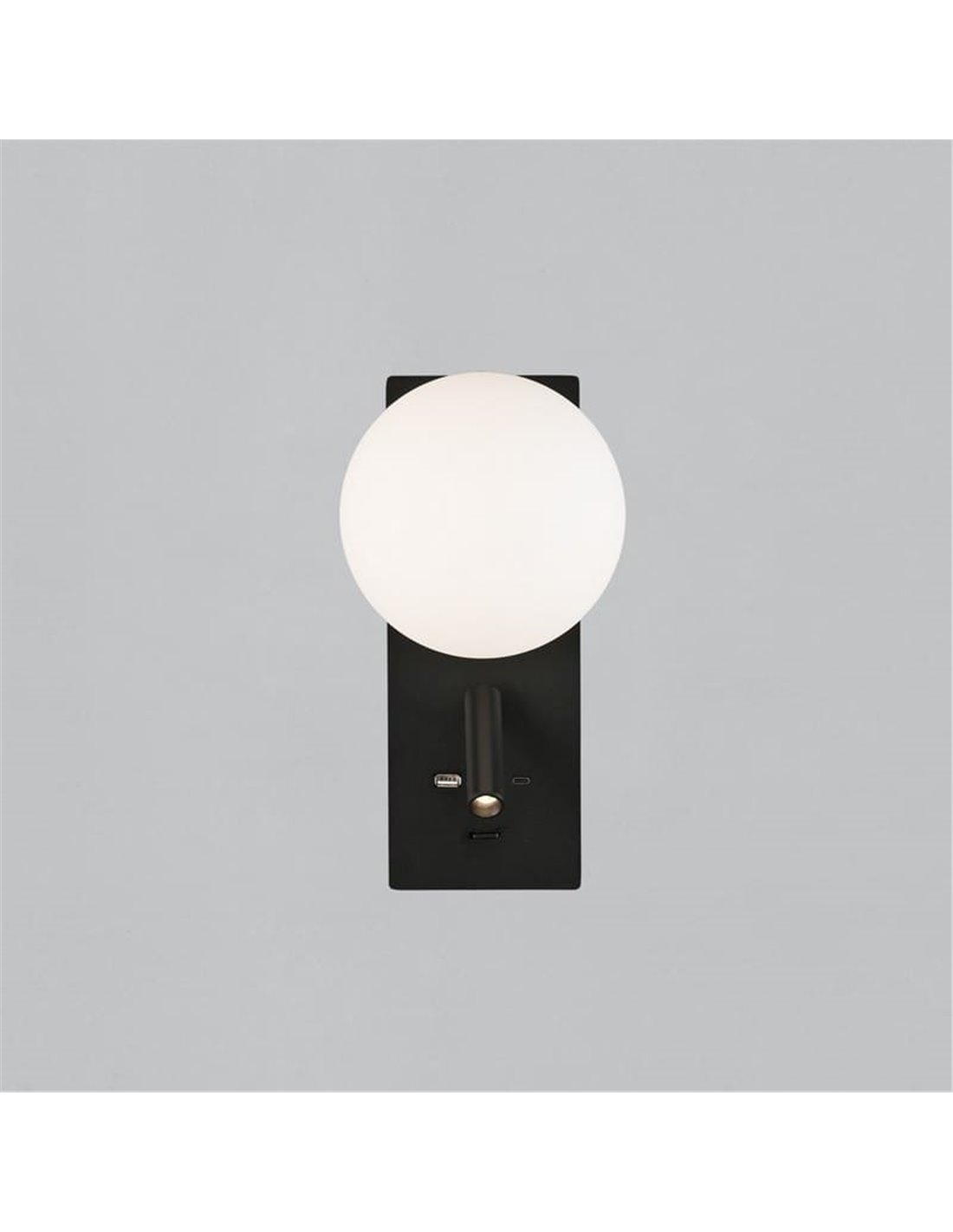 Applique d'intérieur LED avec spot lecteur orientable KIN Noir/Nickel avec abat-jour rond Opale, LED 8W 2700K 370lm + 3W 2700K 285lm avec USB et USBC pour recharger le mobile