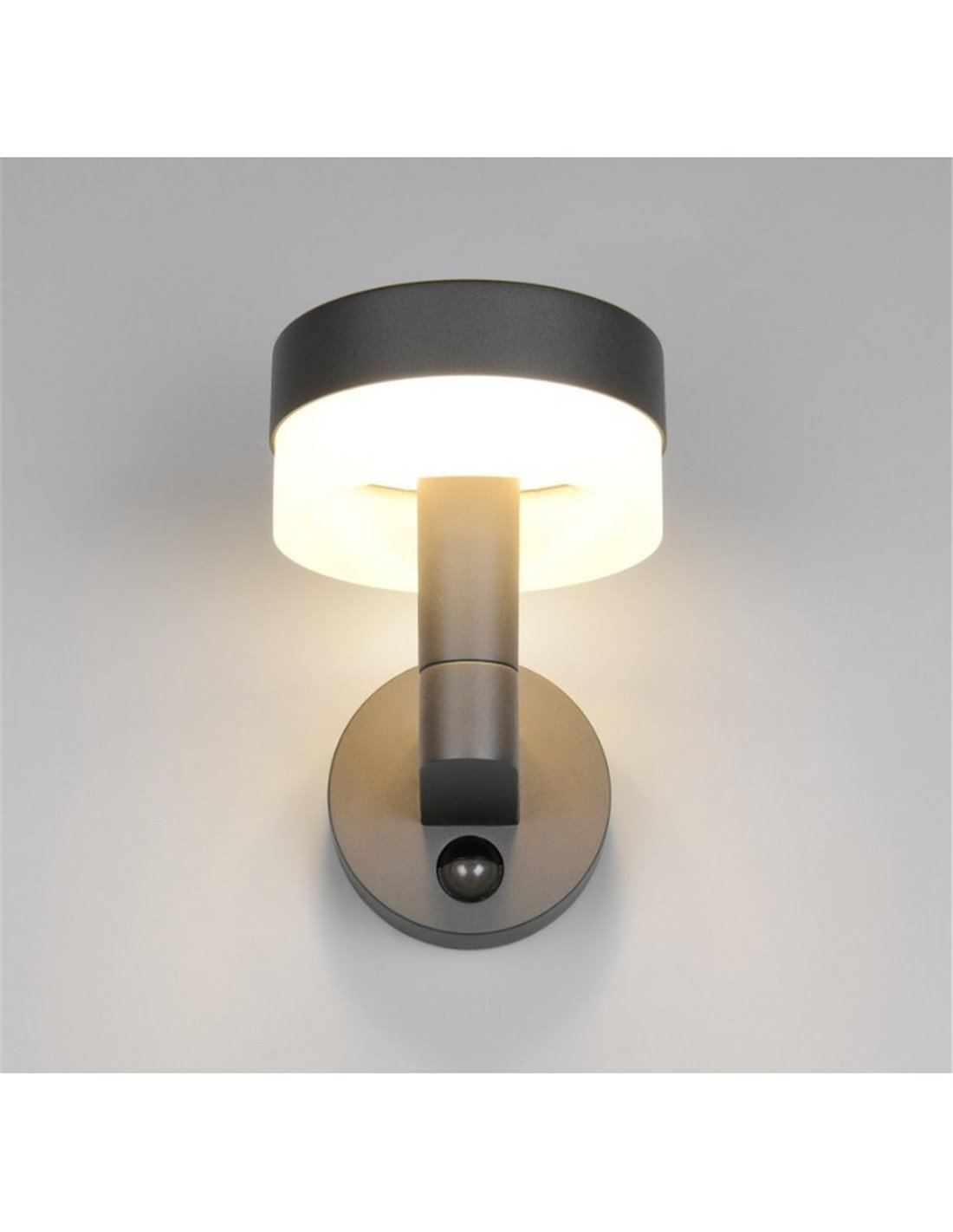 Applique murale d'extérieur LED MACKENZIE avec détecteur de mouvement. Design moderne en fonte d'aluminium avec finition anthracite. Puissance de 8 W, 800 lm et lumière chaude de 3 000 K. Protection IP44, idéal pour les entrées et les terrasses.