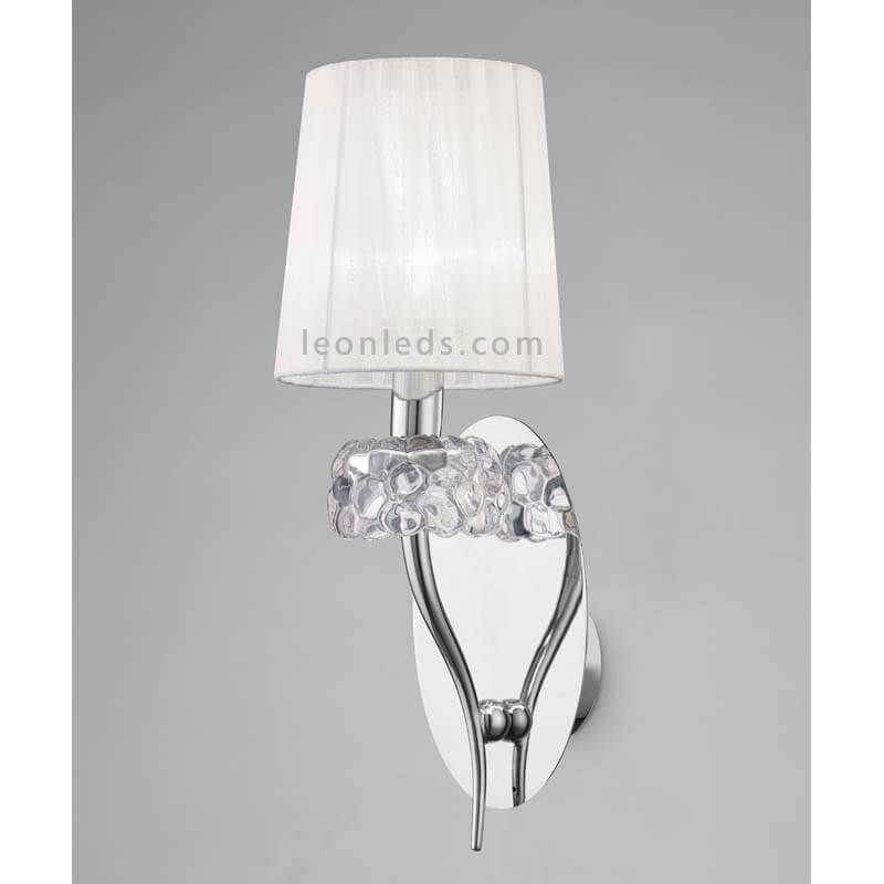 L' applique murale chromée LOEWE allie un design classique à des détails décoratifs et à un élégant abat-jour en textile blanc .