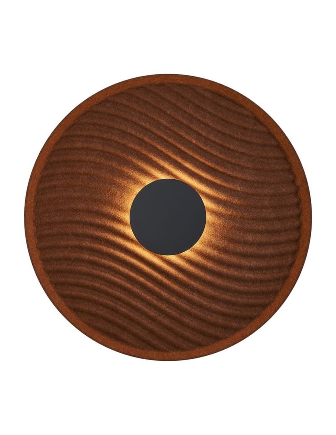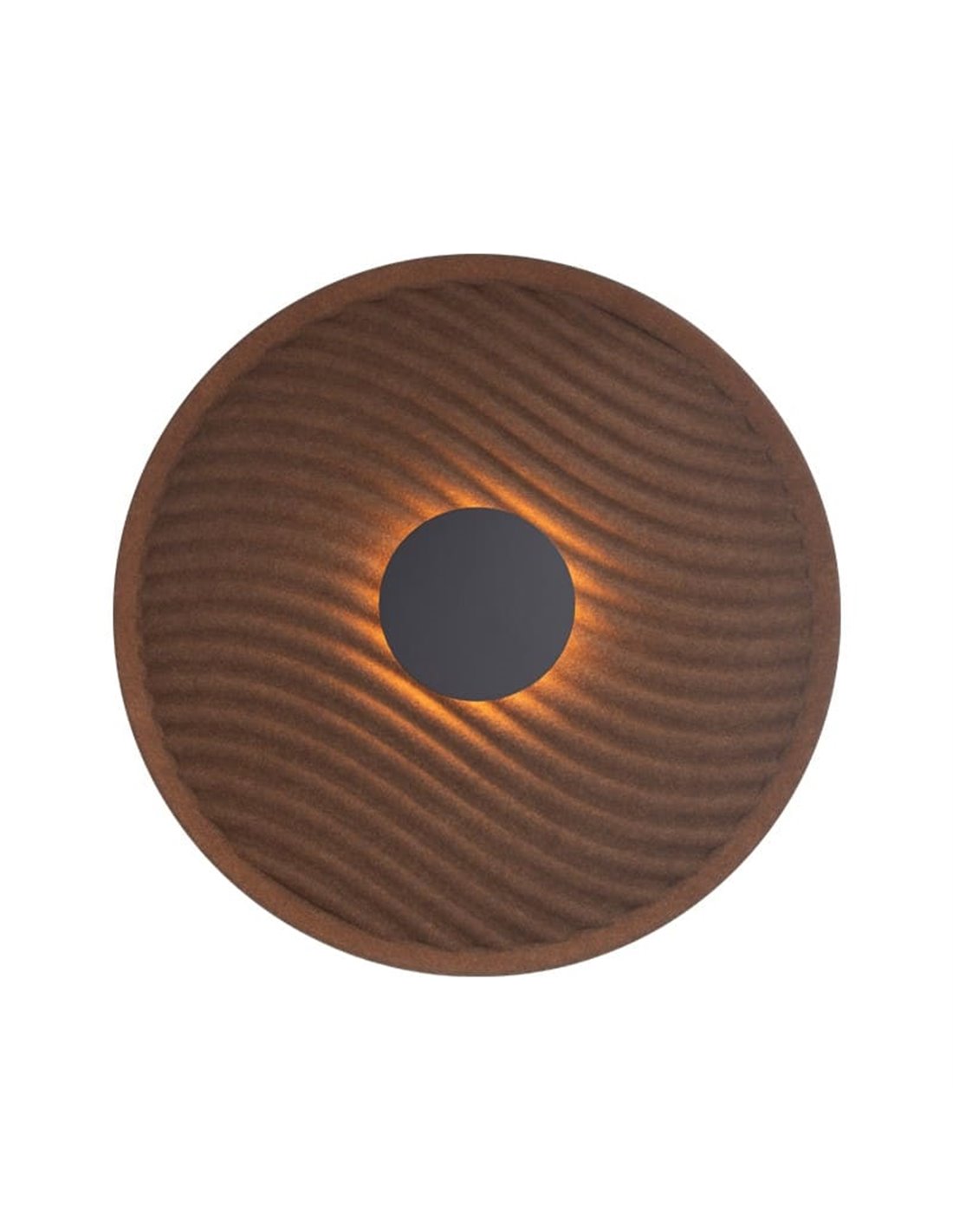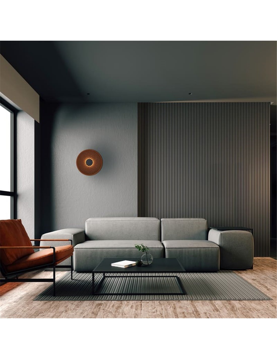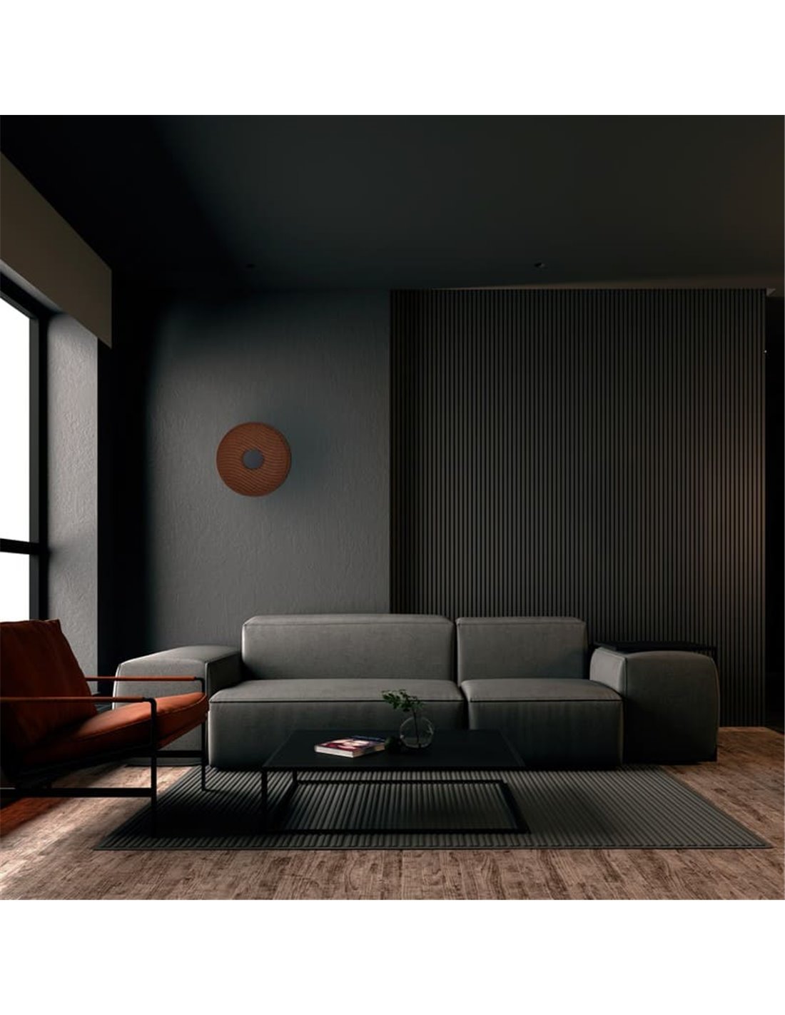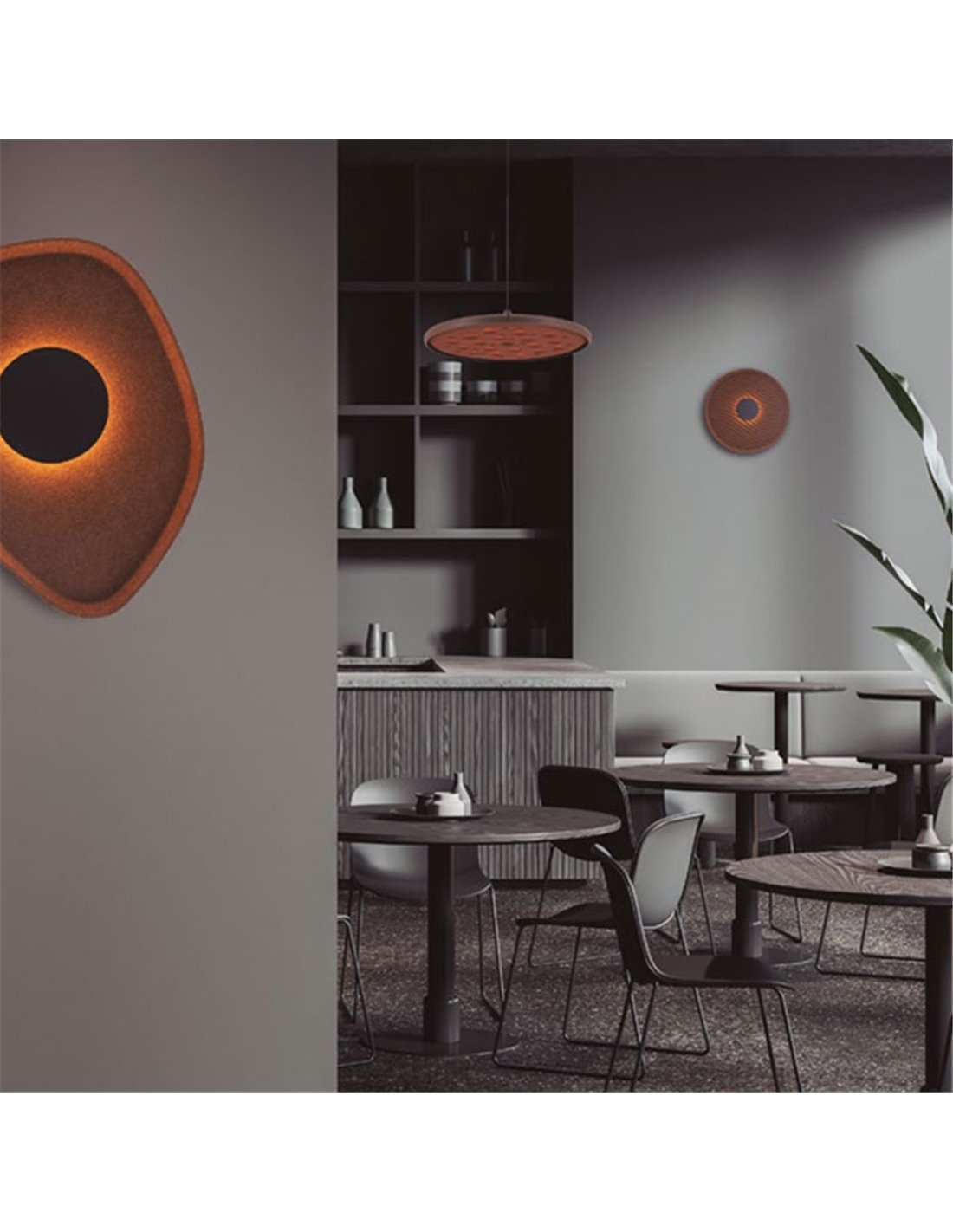 L'applique murale ACUSTIC , avec son design circulaire, se distingue par sa forme de disque ondulé intégrant un panneau absorbant spécialement conçu pour réduire l'écho et la réverbération. Sa finition café apporte une touche chaleureuse, tandis que son éclairage LED 3000K crée une ambiance relaxante et confortable.