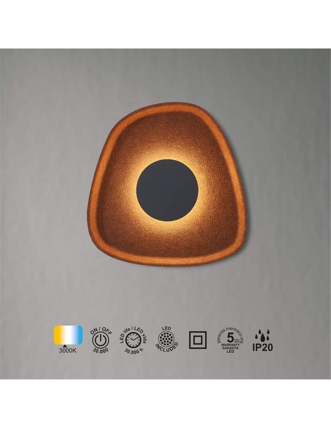 L' applique murale LED ACUSTIC, avec sa forme géométrique irrégulière (Ø 26 cm), offre un éclairage chaleureux et une absorption acoustique , le tout dans un design organique qui dynamise n'importe quel mur. Dotée d' une LED de 5 W , d'une température de couleur de 3 000 K et d'un flux lumineux de 475 lumens , elle est idéale pour créer une ambiance chaleureuse et améliorer le confort acoustique dans les petits espaces ou les couloirs.