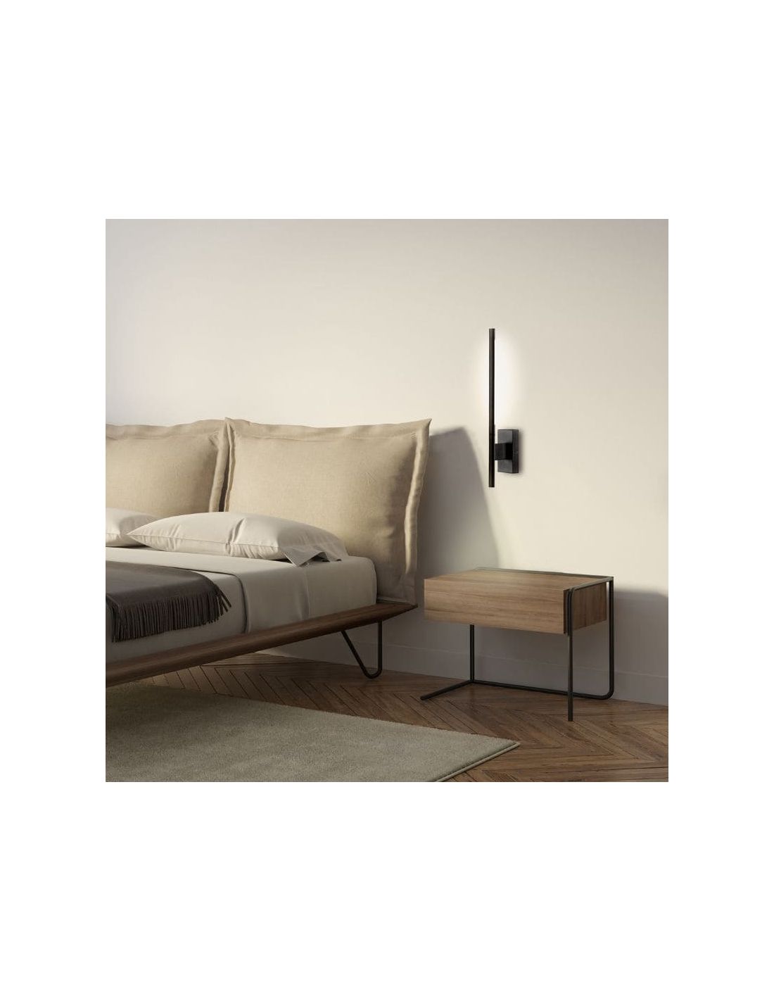 Sa finition noire apporte caractère et contraste, s'intégrant parfaitement aux intérieurs contemporains. Sa forme épurée lui permet d'être placé comme éclairage d'appoint dans les couloirs, les salons ou les chambres, apportant chaleur et élégance à chaque recoin.