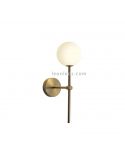 Applique moderne en métal Doris avec boule de verre par ACB Iluminación. Il est composé d'un support mural rond avec une petite barre horizontale qui contient une autre barre verticale mince qui comprend l'abat-jour sphérique en verre opalisé blanc.