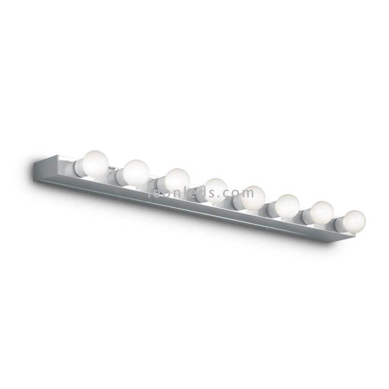 L'applique murale grand miroir salle de bain Hollywood Prive' AP8 8xE14 du fabricant italien Ideal Lux est parfaite pour éclairer les miroirs d'un certain air moderne et élégant, grâce à son effet Hollywood composé de 8 ampoules réparties le long de sa structure de 80,5 cm. Ces ampoules ne sont pas incluses et doivent avoir une douille E14. Il est fabriqué avec un corps métallique et son absence de diffuseur permet de monter une large gamme d'ampoules, jusqu'à 8 avec une puissance maximale de 40W. L'utilisation de cette applique est très confortable car, comme elle n'inclut pas les ampoules, nous pouvons sélectionner la tonalité de lumière que nous aimons le plus, de la lumière plus froide à la lumière chaude, bien que nous recommandions une tonalité de lumière de 4 000 K.