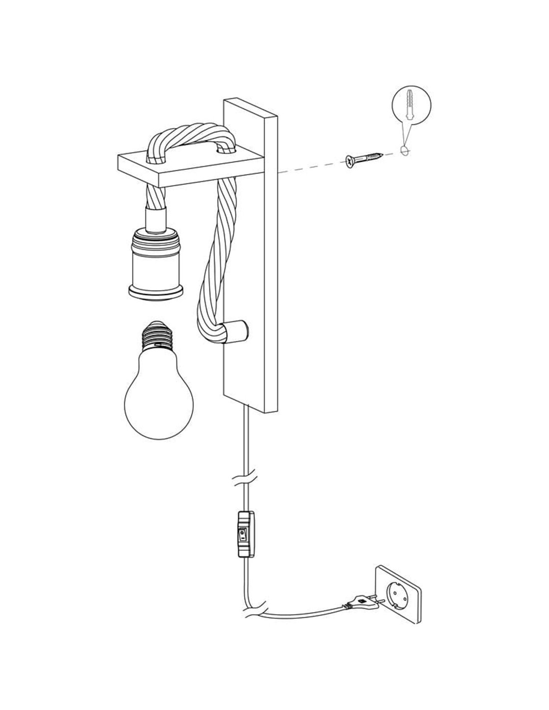 Applique RAMPSIDE de Eglo, avec corde de chanvre et bois d'hévéa et douille en métal noir. Compatible avec les ampoules E27 (non incluses). Idéal pour ajouter une touche vintage à n'importe quelle pièce.