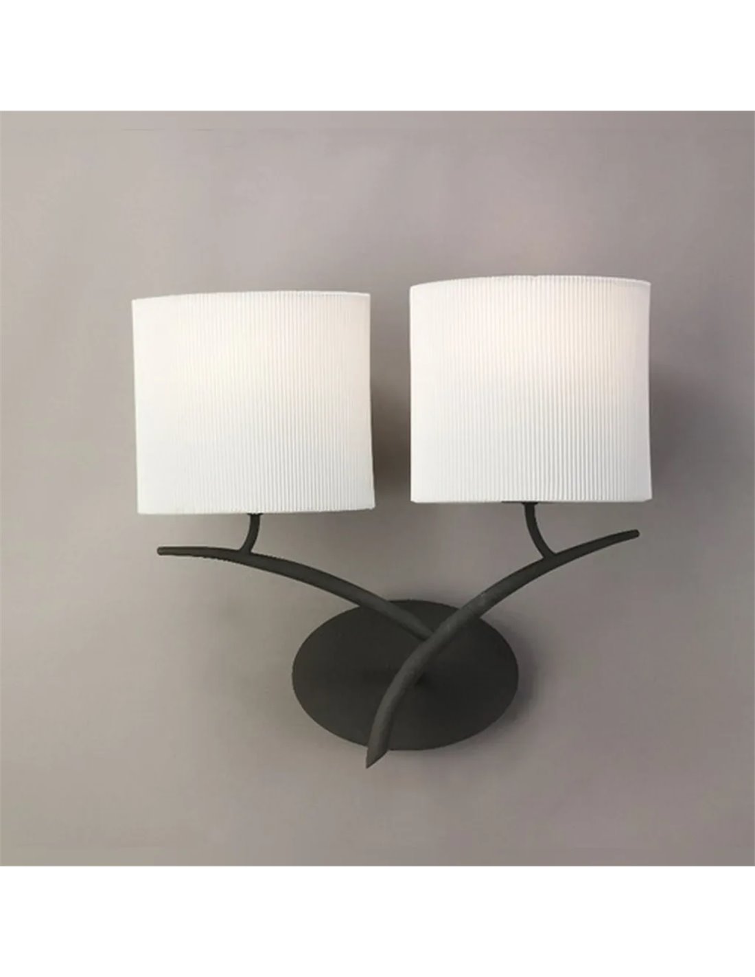 L' applique murale EVE, finition anthracite, est une applique décorative qui se distingue par son design élégant avec ses bras incurvés et son double abat-jour en textile blanc , idéale pour ajouter chaleur et style à n'importe quelle pièce.