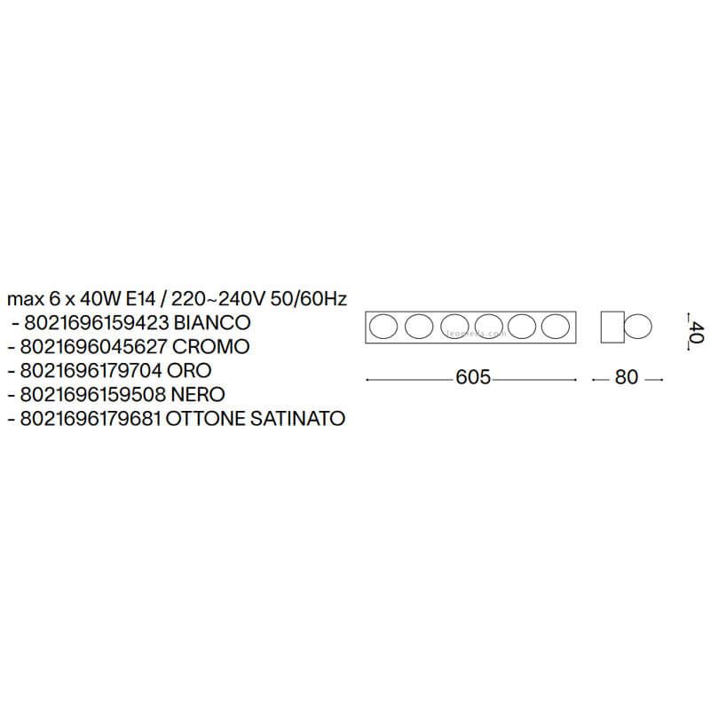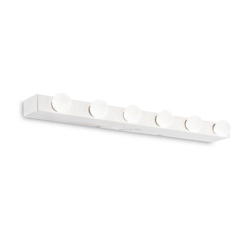 L'applique murale type Hollywood modèle Prive' AP6 6xE14 du fabricant italien Ideal Lux est parfaite pour éclairer les miroirs d'un certain air moderne et élégant, grâce à son effet Hollywood composé de 6 ampoules réparties le long de sa structure de 60,5 cm. Ces ampoules ne sont pas incluses et doivent avoir une douille E14. Il est fabriqué avec un corps métallique et son absence de diffuseur permet de monter une large gamme d'ampoules, jusqu'à 6 avec une puissance maximale de 40W. L'utilisation de cette applique est très confortable car, comme elle n'inclut pas les ampoules, nous pouvons sélectionner la tonalité de lumière que nous aimons le plus, de la lumière plus froide à la lumière chaude, bien que nous recommandions une tonalité de lumière de 4 000 K.