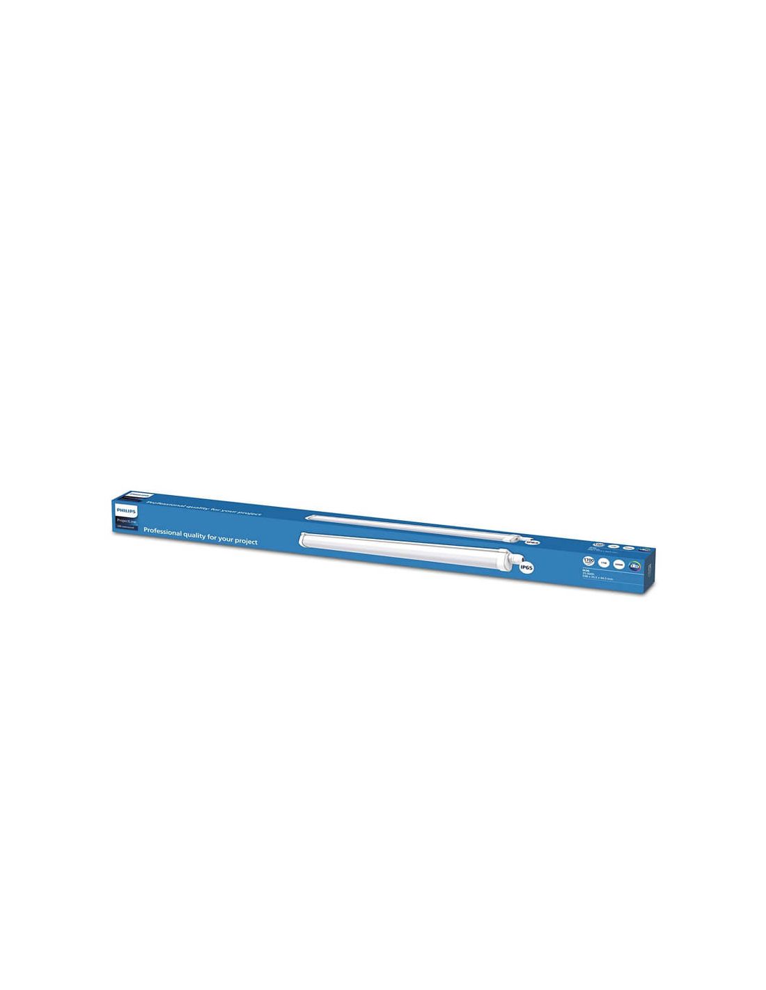 Bande LED blanche de 60 cm de long d'une puissance de 17 W, d'une puissance lumineuse de 1 700 Lm à 4000 K. Cette multiprise est complètement étanche et résistante aux chocs, IP65 et IK06, comprend tout le nécessaire pour l'installation, gamme Philips ProjectLine Waterproof.