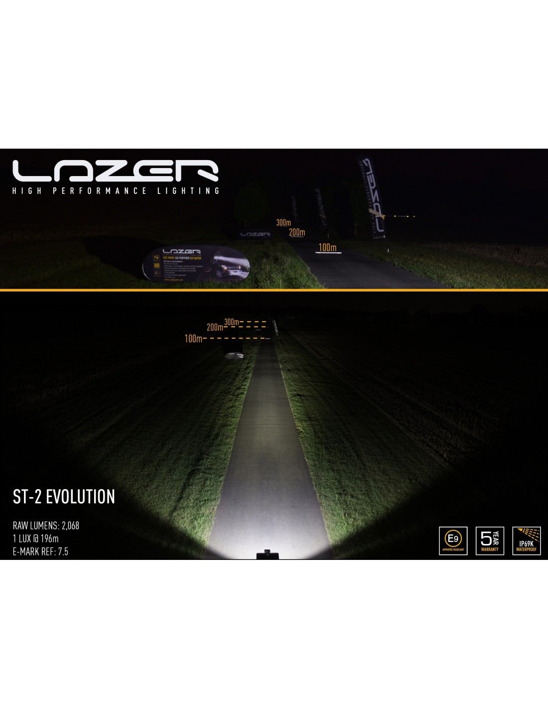 Barre LED pour véhicules 4X4, Camions, Voitures de la marque Lazer. Le modèle ST2 Evolution est le plus petit bar de ce constructeur mais il parvient à nous offrir 0.25Lx à près de 400m de portée. Cette barre a l'homologation ECE R112 avec 7,5 points lumineux .