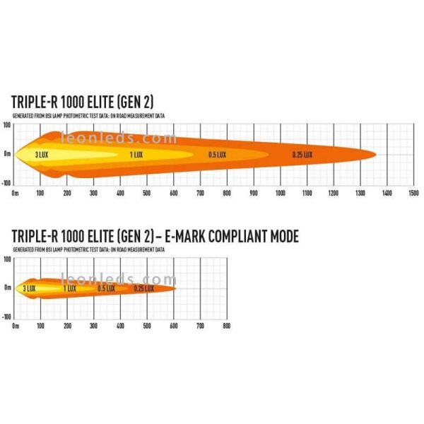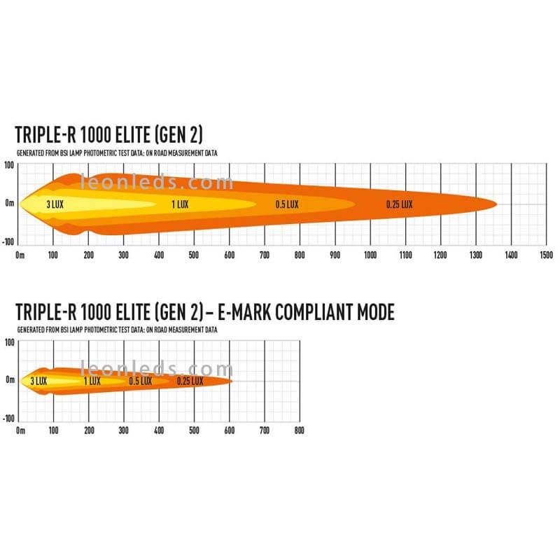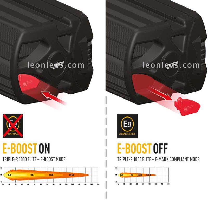 Cette génération 2 Triple R 1000 Elite LED Bar offre la technologie E-Boost , si nous insérons le connecteur inclus, nous obtenons cette barre LED pour offrir une puissance de 104W , une intensité lumineuse de 10 136Lm avec une portée de faisceau de 0,25lx à 1 358 mètres (avec ce connecteur inséré, la Barre Led Triple R 1000 Elite n'est pas homologuée), si on enlève le connecteur, cette Barre Led est conforme à l'homologation E9 et offre une puissance de 23W, une intensité lumineuse de 2 534Lm avec un faisceau lumineux de portée de 607 mètres avec 0,25 Lux. Vous pouvez le compléter avec l'interface CAN et les accessoires sans contact CAN.