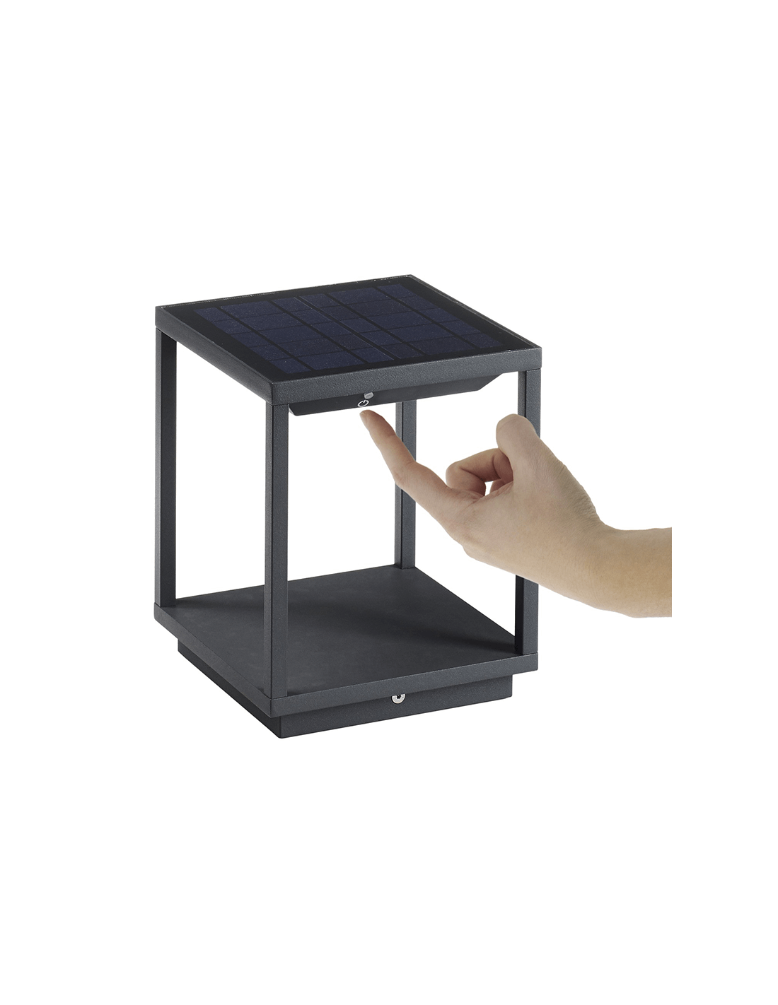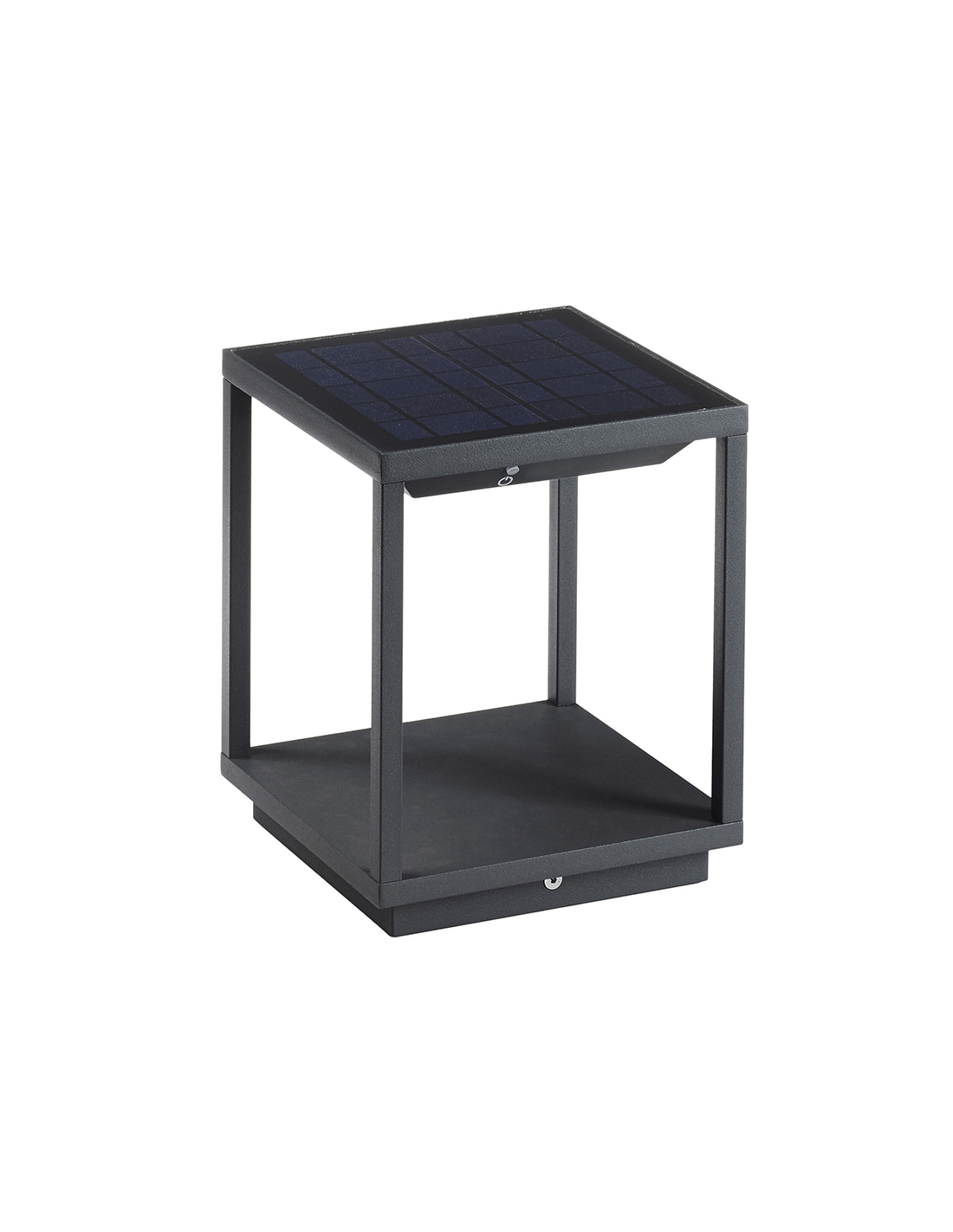 La balise LED extérieure solaire carrée de la série SOLEI par Dopo a une puissance de 3,5W projetant 300 lumens d'intensité avec une tonalité lumineuse chaude de 3000K.