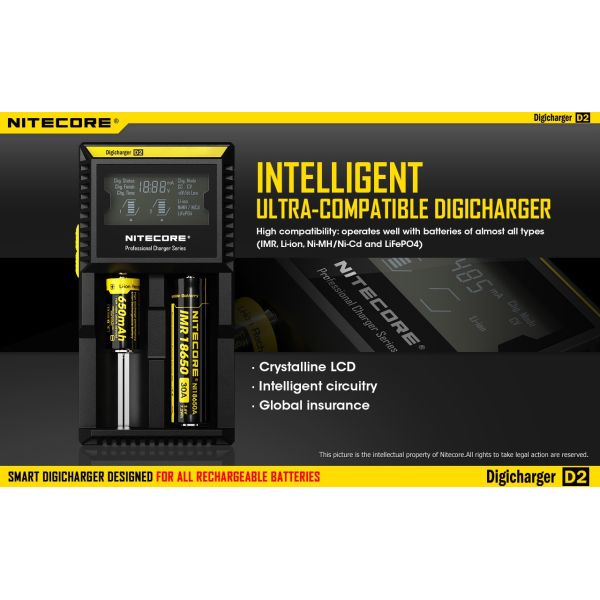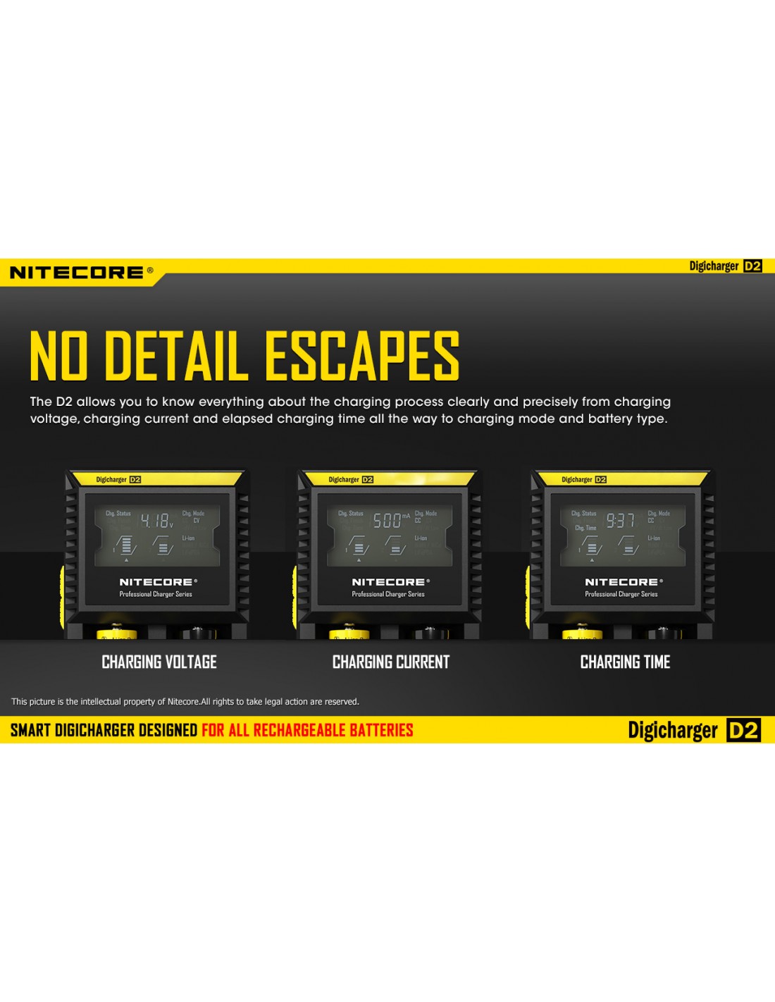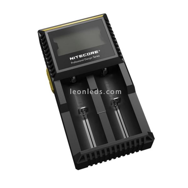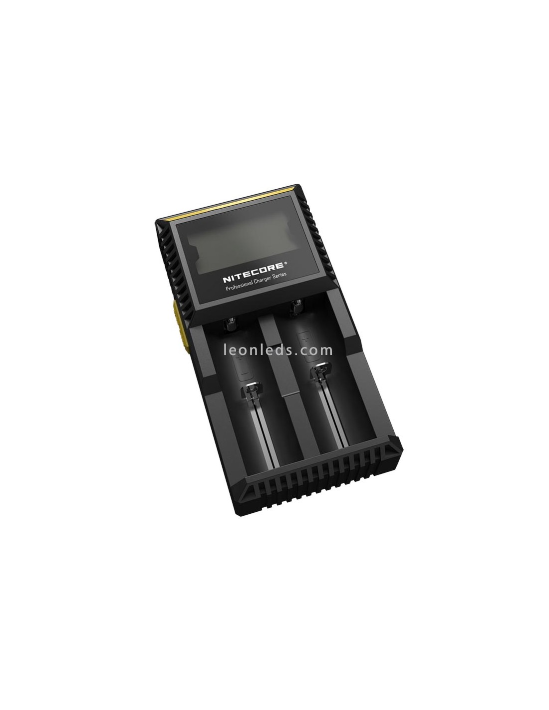 Chargeur pour 2 batteries D2 de marque Nitecore avec affichage LCD de la charge de la batterie en tension et en milliampères mA. Ce chargeur a une détection automatique du type de batterie, il n'est pas nécessaire d'indiquer quel type de batterie nous devons charger, il indique également à l'écran le type de batterie que nous voulons charger. Il indique également le temps restant pour charger complètement les batteries. Ce chargeur permet de charger 2 batteries simultanément.