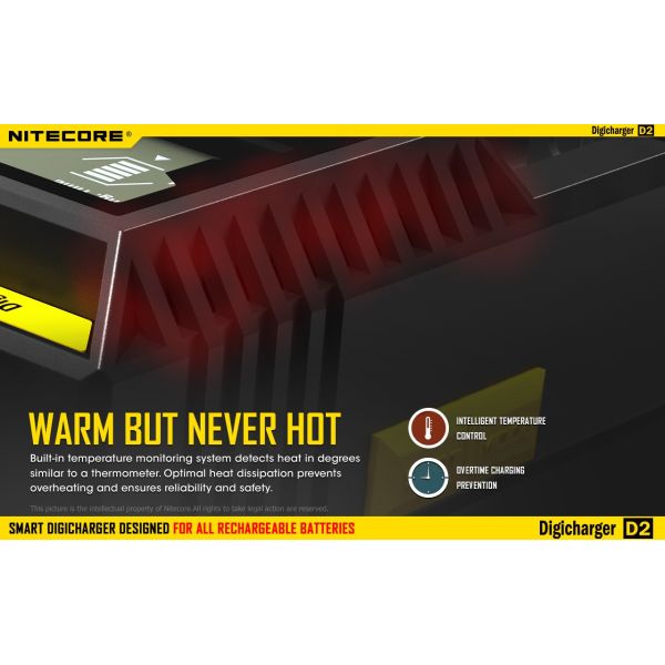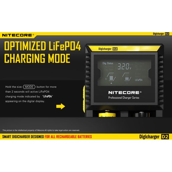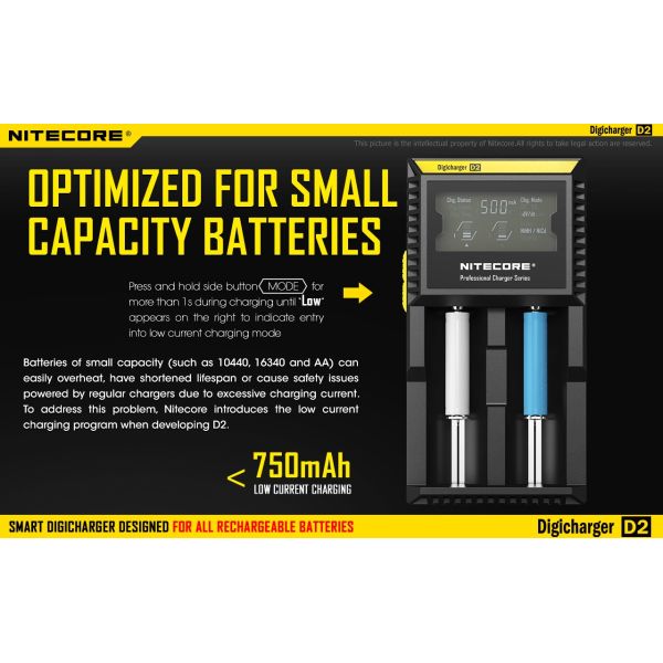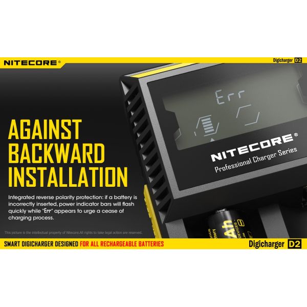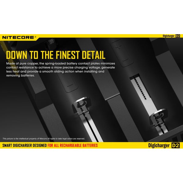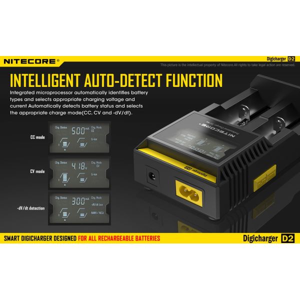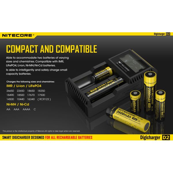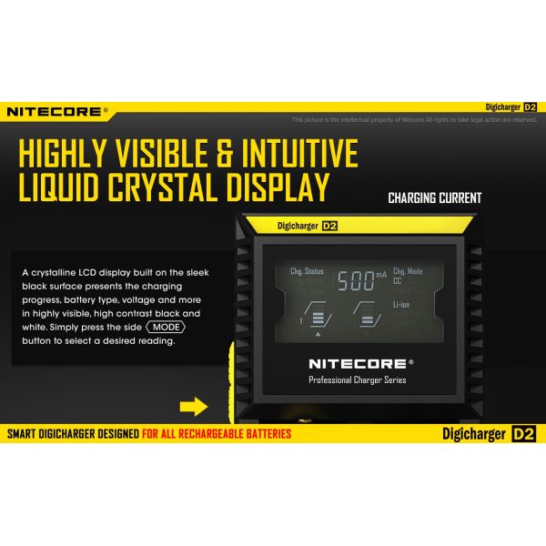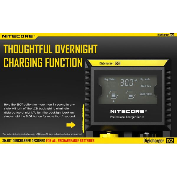 Chargeur pour 2 batteries D2 de marque Nitecore avec affichage LCD de la charge de la batterie en tension et en milliampères mA. Ce chargeur a une détection automatique du type de batterie, il n'est pas nécessaire d'indiquer quel type de batterie nous devons charger, il indique également à l'écran le type de batterie que nous voulons charger. Il indique également le temps restant pour charger complètement les batteries. Ce chargeur permet de charger 2 batteries simultanément.