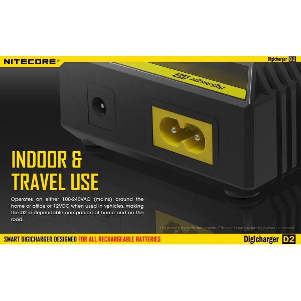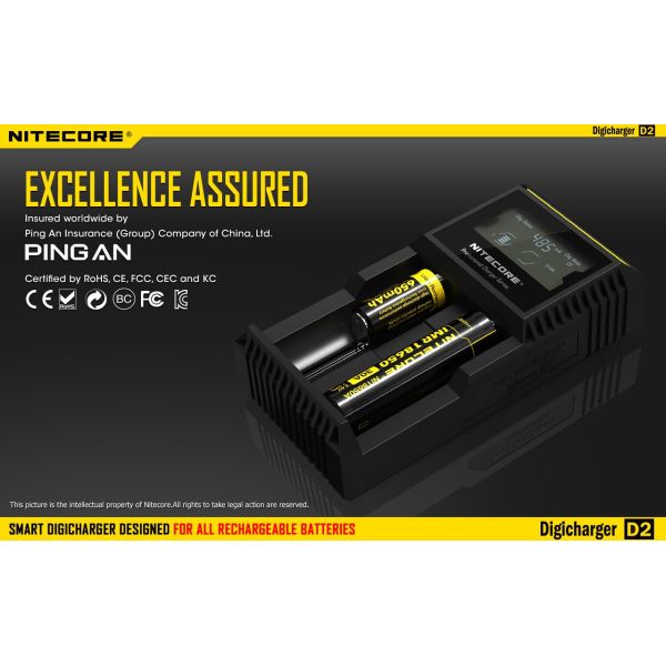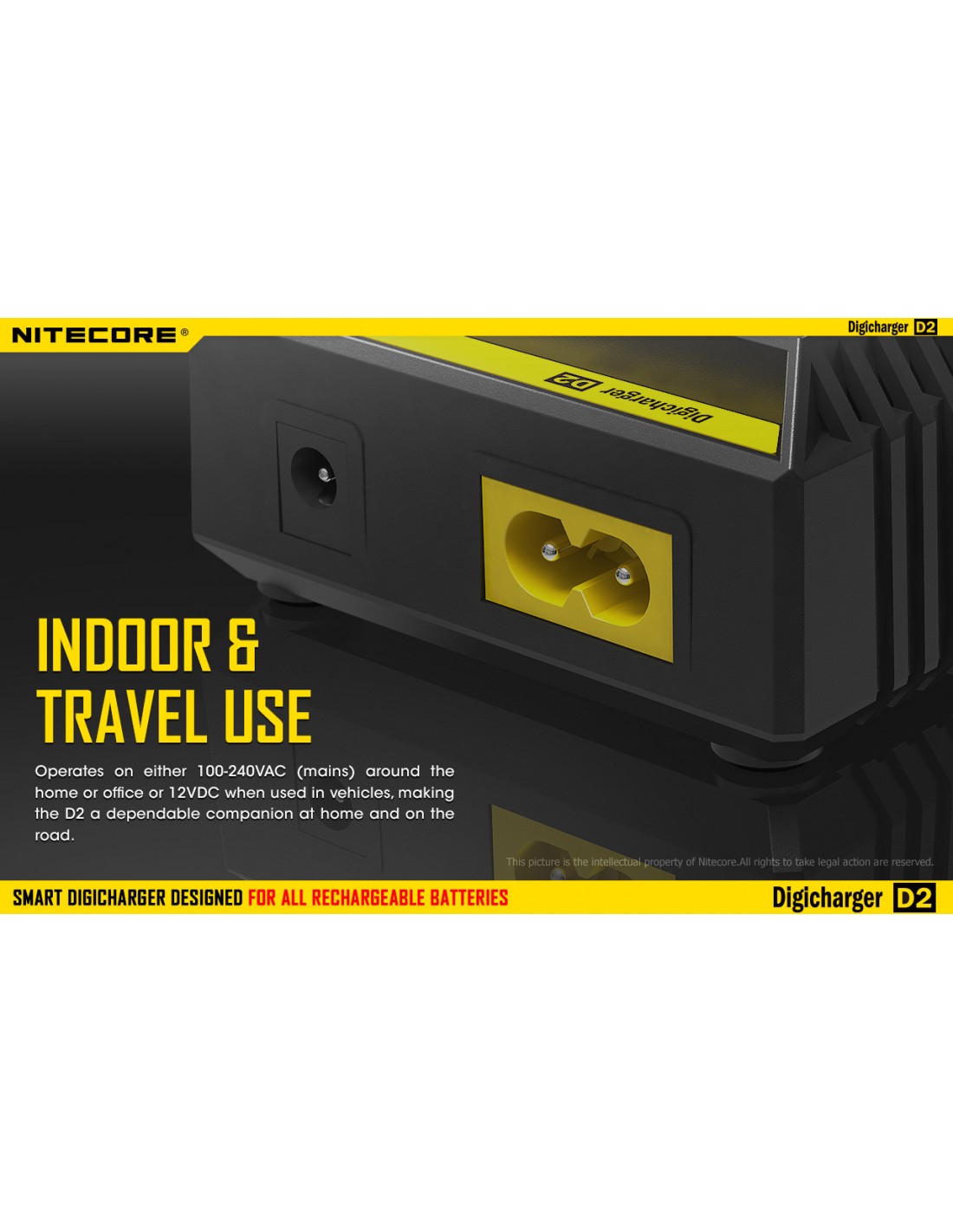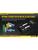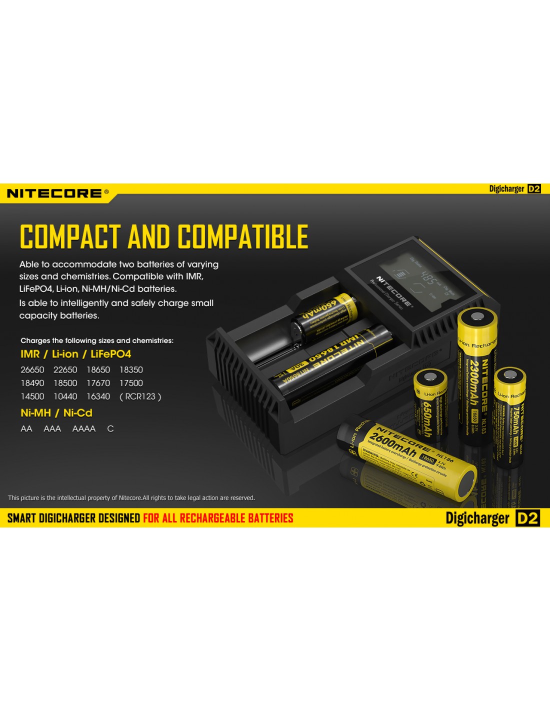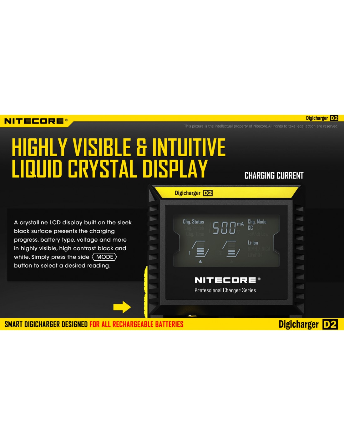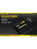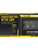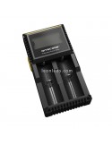 Chargeur de batterie Nitecore modèle D2 qui permet de charger 2 batteries simultanément avec indicateur de charge LCD.