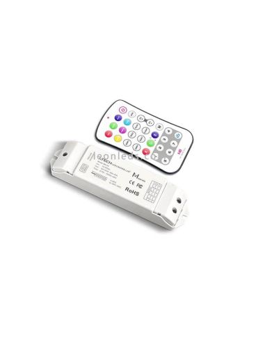 Contrôleur pour bande LED RGBW de la marque Ltech, modèle M7+M4-3A Contrôleur RGBW, valable pour 12v et 24V DC, 4 canaux pour 5 A et un maximum de 20A. La puissance totale est de 0 à 120W pour 4 canaux, permettant d'installer en 24V jusqu'à 480W de puissance, 5 bandes LED RGBW de 72W chacune, atteignant jusqu'à 30 mètres du récepteur à la télécommande.
