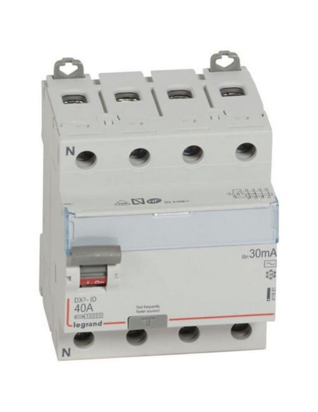 Legrand DX³-ID 411661E — Disjoncteur différentiel 4P , 40 A , 30 mA type AC pour 400 V. Conçu pour la protection des personnes contre les défauts à la terre dans les réseaux triphasés avec neutre. Montage sur rail DIN (4 modules) et compatibilité avec les auxiliaires DX³ et les peignes HX³ .
