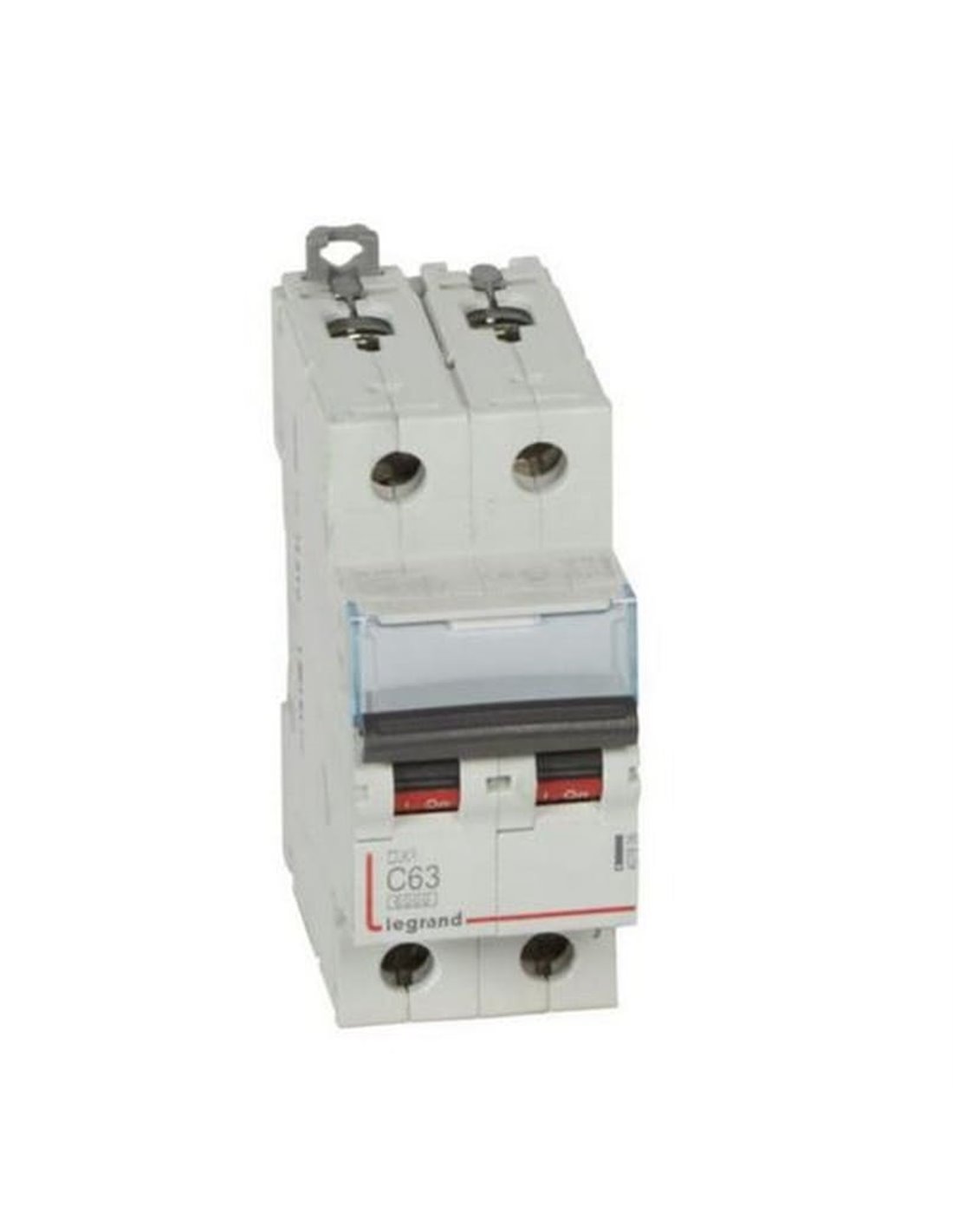 Interrupteur magnétothermique automatique Legrand DX³ 2P 63 A, courbe C , pouvoir de coupure 6 kA selon la norme IEC/EN 60898-1 . Bornes IP20 (protection des doigts), limitation d'énergie classe 3 et voyant marche/arrêt . Compatible avec les peignes à fourche et le système de connecteurs HX³ . Format 2 modules pour rail DIN, 230/400 V CA. Compatible avec les auxiliaires et les dispositifs différentiels DX³ .