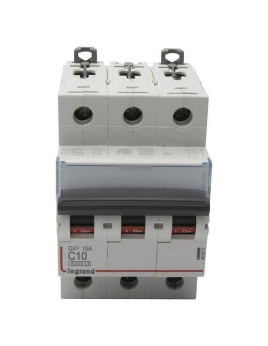 Interrupteur magnétothermique automatique Legrand DX³ 3P 10 A, courbe C , pouvoir de coupure 6 kA , conforme à la norme IEC/EN 60898-1 . Bornes IP20 (protection des doigts), limitation d'énergie classe 3 et voyant ON/OFF . Compatible avec câble, peigne à fourche et fiche HX³ . Format 3 modules pour rail DIN, 400 V CA. Compatible avec les auxiliaires et les dispositifs différentiels DX³ .