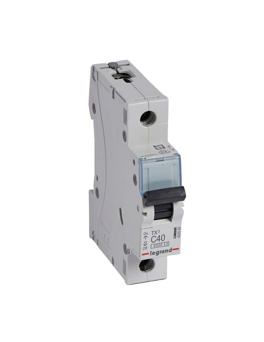 Le disjoncteur Legrand TX³ 403580 protège le circuit contre les surcharges et les courts-circuits . Modèle unipolaire , 40 A , courbe C et pouvoir de coupure 6 kA , adapté aux lignes 230 V~ avec pics de démarrage modérés (induction puissante, capacité AA supérieure, prises dédiées). Installé sur rail DIN , il occupe 1 module et permet le raccordement par jeu de barres et câble avec bornes à vis . Conception IP20 , sans halogène et réarmement rapide par levier frontal pour un rétablissement de service en toute sécurité.