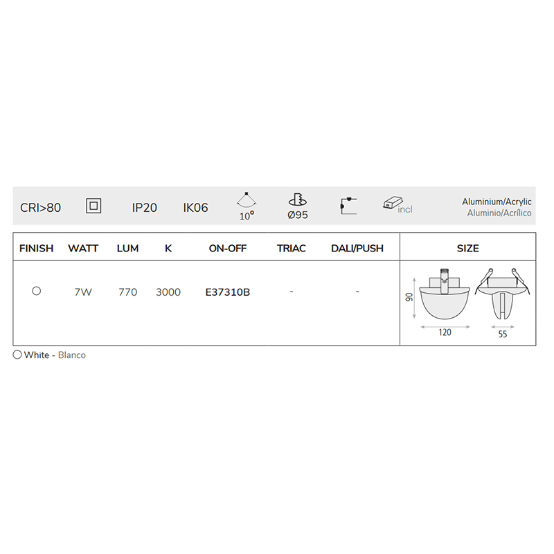 Il dispose d'une LED intégrée qui fournit une puissance lumineuse de 7W et 770lm qui est combinée à une température de couleur blanc chaud de 3 000K. Il dispose également d'un IP54 et d'un IRC>80.