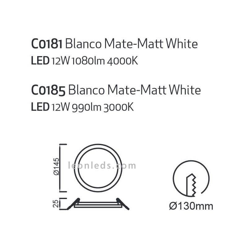 Downlight LED rond moyen 14,5Cm Saona 12W d'une puissance de 12W, une intensité lumineuse de 990Lm en 3000K et 1080Lm en 4000K de la série Saona, disponible en 2 nuances de lumière, Lumière Chaude 3000K et Lumière Naturelle 4000K.