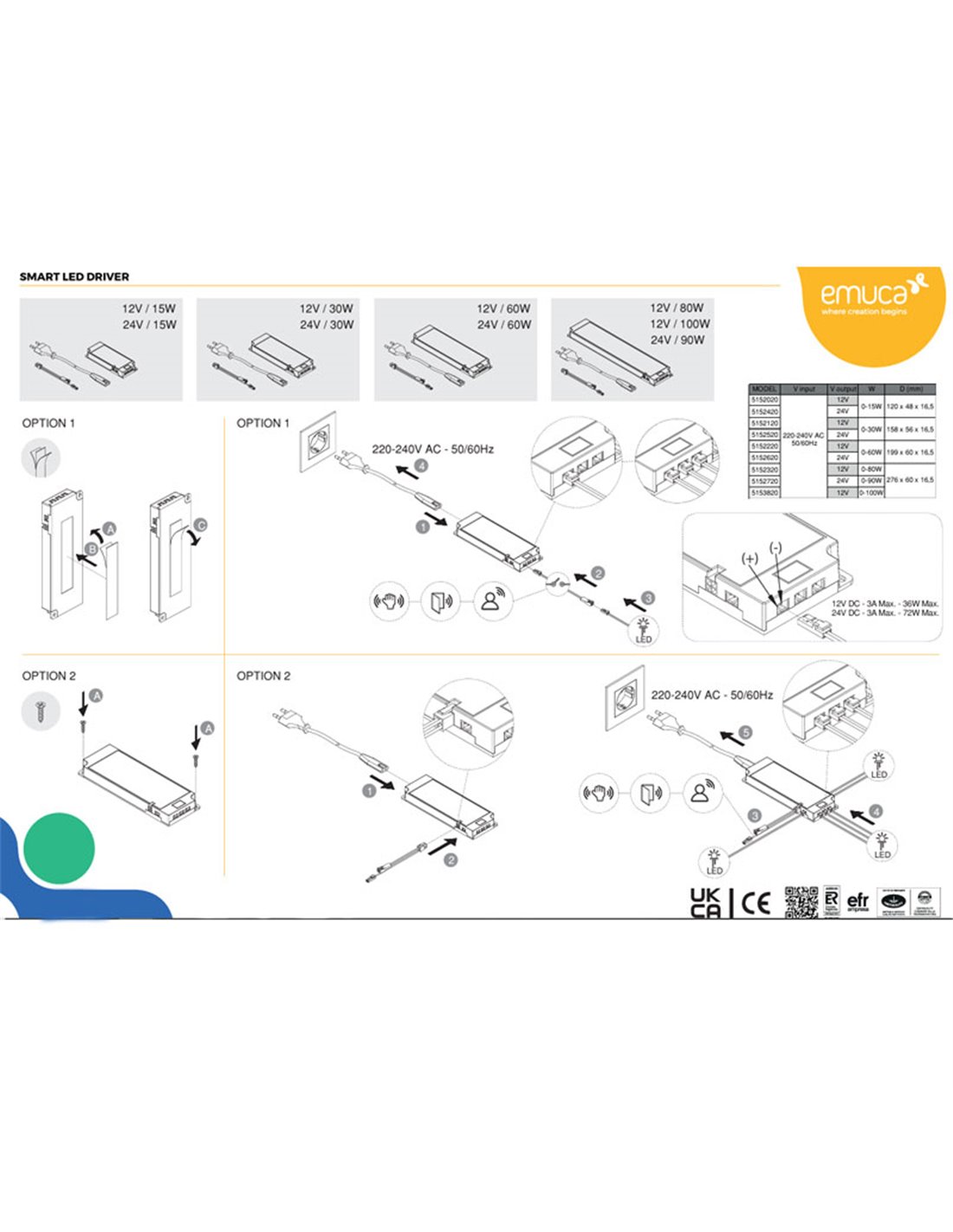 - Compatibilité SMART : Il comprend un port de contrôle qui permet la connexion des capteurs Emuca SMART, centralisant l'allumage et l'extinction de tous les luminaires connectés et simplifiant la gestion de l'éclairage.