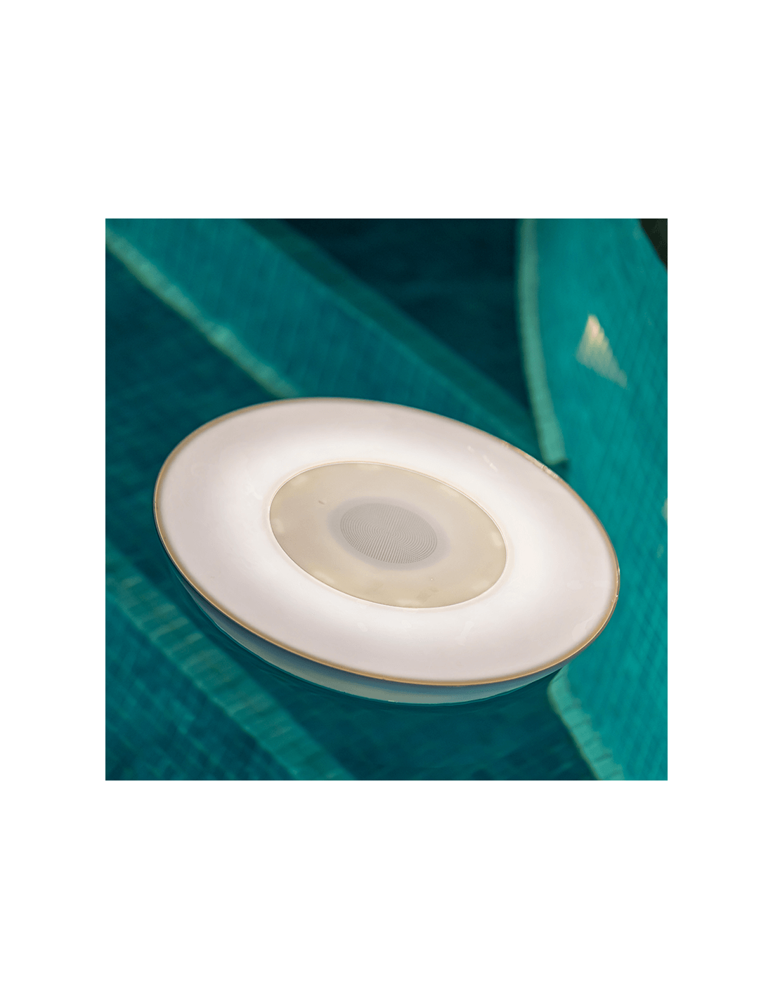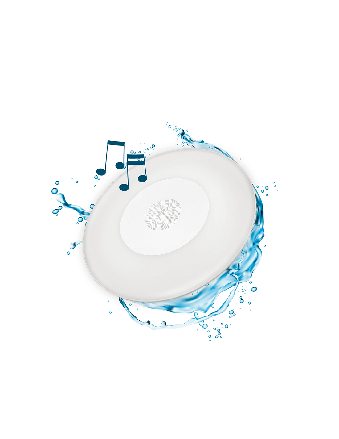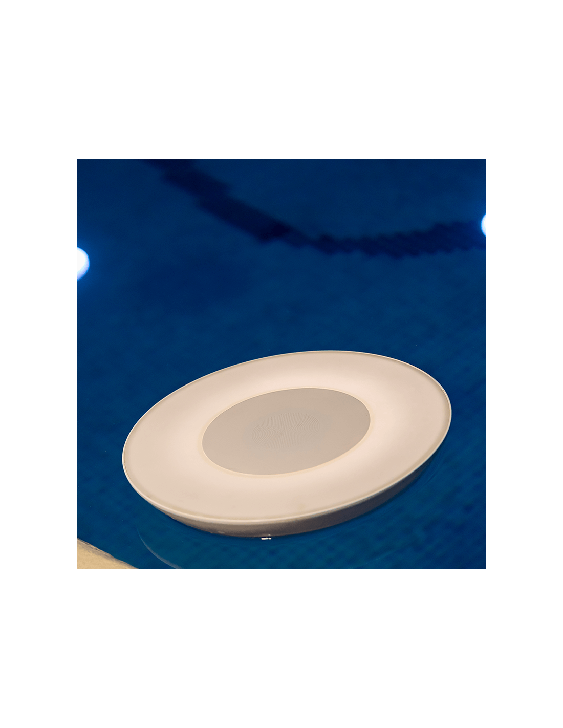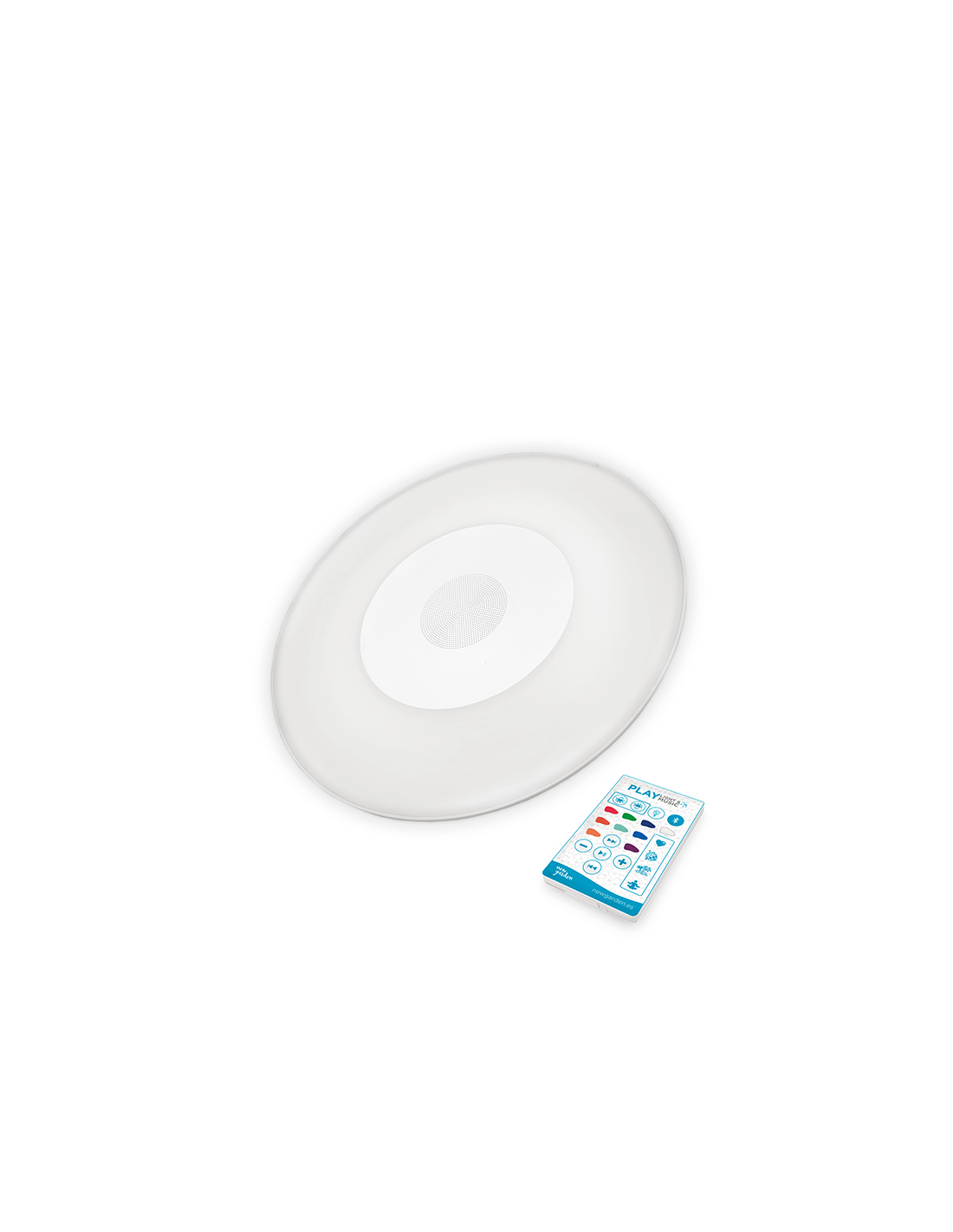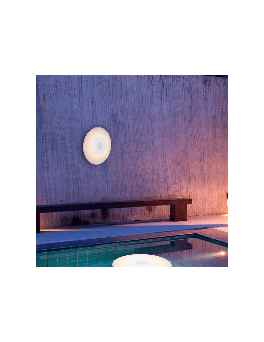 Cette applique murale/enceinte Play Disk Wall&Pool possède un corps sphérique de 38 cm de diamètre et de 6 cm de profondeur, où sont intégrées des caractéristiques irrésistibles.