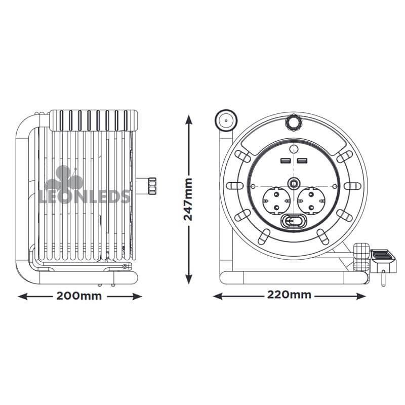 Il est conçu pour collecter 25 mètres de câble 3x1.5mm2 H05VV-F 3G1.5 . Le boîtier comprend 2 prises Schuko + 2 USB , un interrupteur ON/OFF et un indicateur de fonctionnement. Il comprend également un guide-câble et une poignée amovible pour enrouler le câble plus facilement.