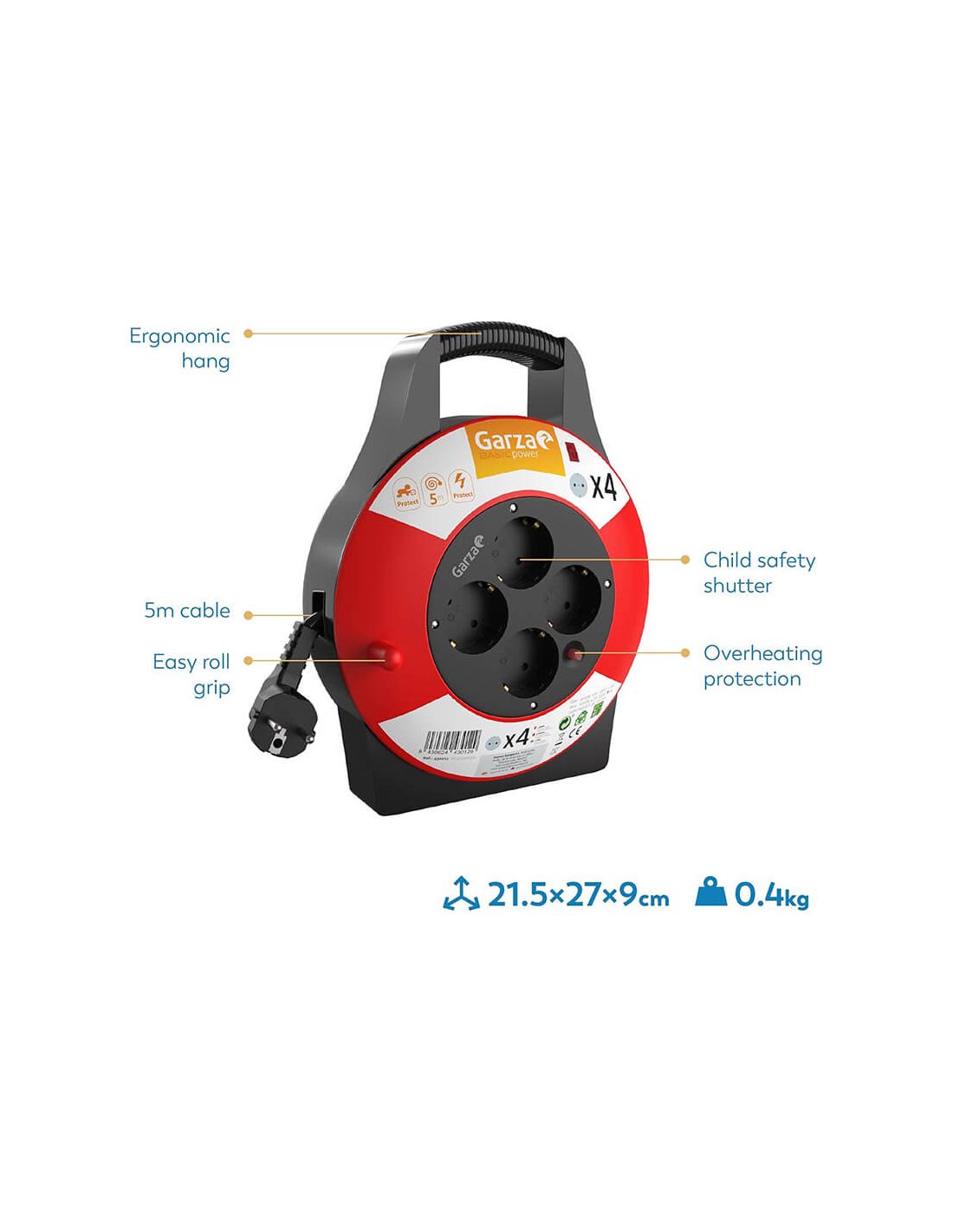 L' enrouleur de câble domestique Garza Power de 5 m est la solution idéale pour ceux qui recherchent une rallonge électrique compacte, sûre et facile à transporter . Grâce à sa conception ergonomique avec poignée intégrée , ses quatre prises Schuko protégées et son câble de 5 mètres , il est idéal pour les maisons, les bureaux, les ateliers, les caravanes ou les zones de travail où vous avez besoin d'une rallonge électrique en toute sécurité.