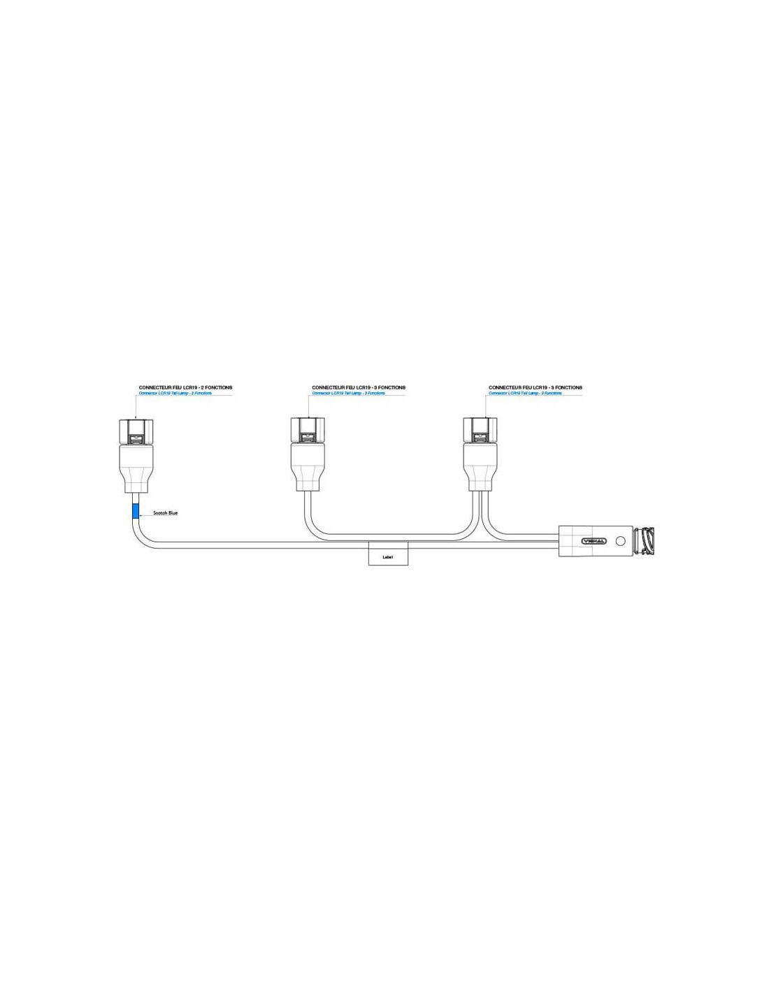 Faisceau Vignal FCA avec connecteur AMP 7 broches et 3 sorties AMP MCP 4 broches , conçu pour installer 3 feux arrière LED LCR19 (2 avec 3 fonctions et 1 avec 2 fonctions) sur remorques et semi-remorques industrielles Schmitz .