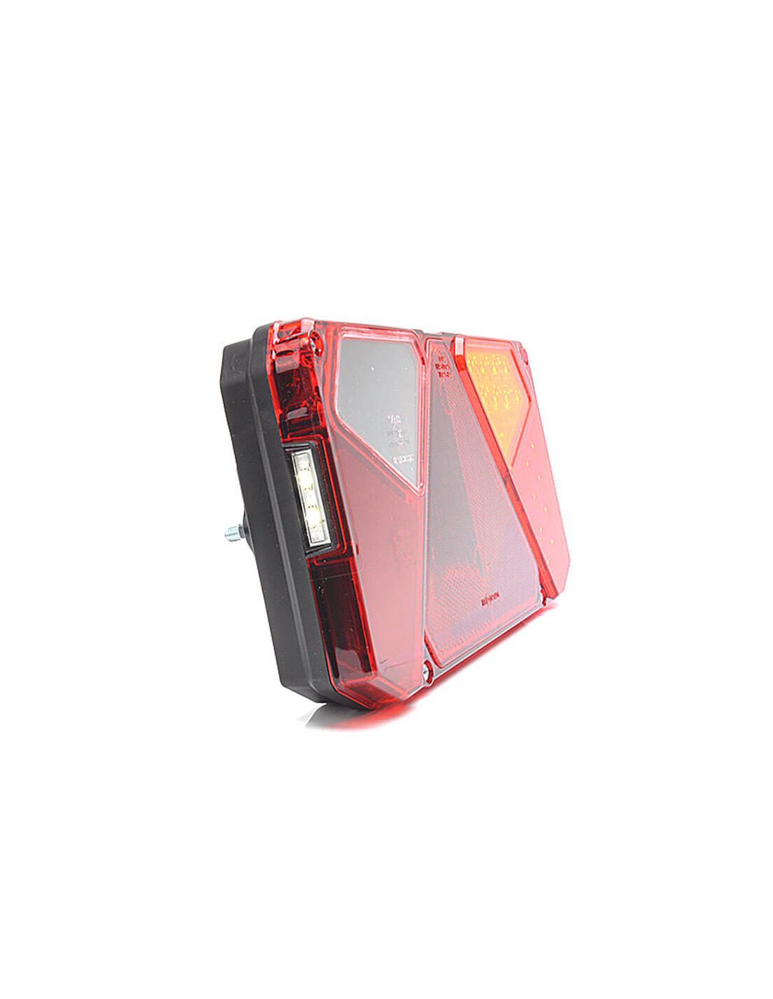 Feu arrière à LED avec triangle et 3 fonctions, plus éclairage latéral de plaque d'immatriculation. Compatible 12 V et 24 V, câble de 2 mètres inclus pour l'installation, et totalement étanche (indice de protection IP68).