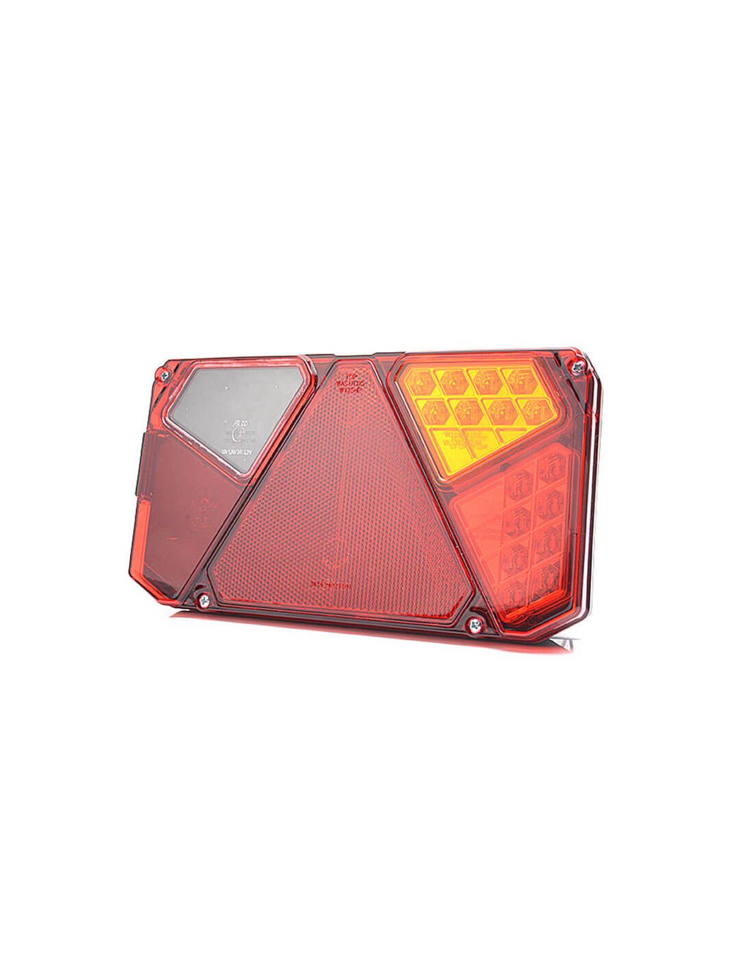 Feu arrière à LED avec triangle intégré et 4 fonctions : position, stop, clignotant et éclairage de plaque d’immatriculation latéral . Compatible avec les systèmes 12 V et 24 V, entièrement étanche (IP68) et submersible. Câble de 2 mètres inclus pour l’installation.