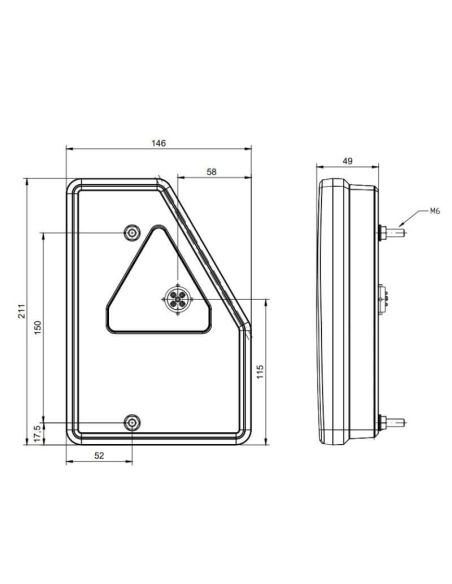 Feu arrière LED haut avec triangle et connecteur 5 broches de la marque Fristom, modèle FT-277 , ne peut être installé que dans des installations 12V. Ce feu arrière LED est homologué, bénéficie d'une garantie de 2 ans et est submersible (IP68). Sa plage de température de fonctionnement est de -40ºC à + 55ºC.