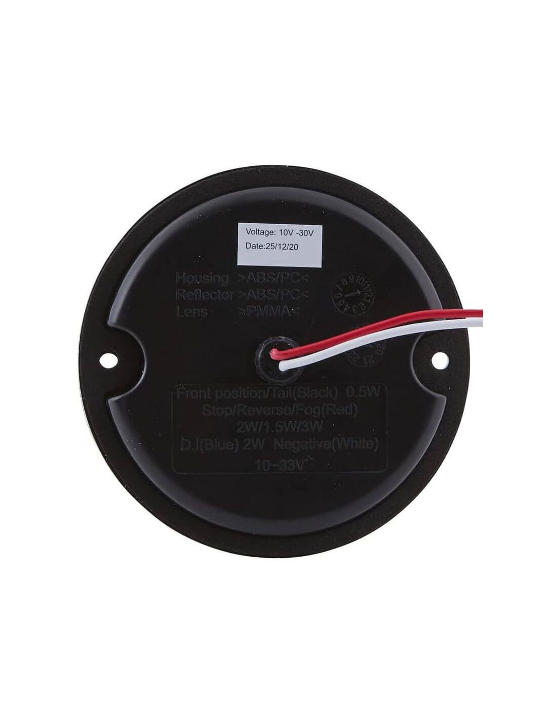 Feu de recul LED HELLA VALUEFIT, Ø 95 mm , compatible 12 V et 24 V , avec 12 LED et une consommation de seulement 1,5 W , boîtier noir et cabochon transparent. Montage arrière à deux points et câble de 260 mm à extrémités ouvertes. Homologué ECE R10/R23 , avec indice de protection IP67 .