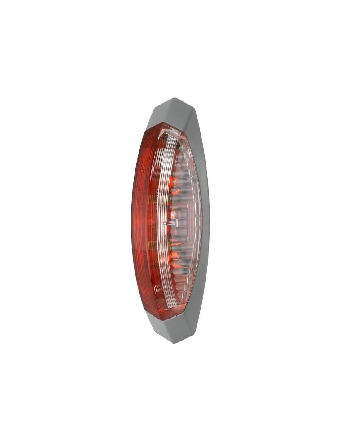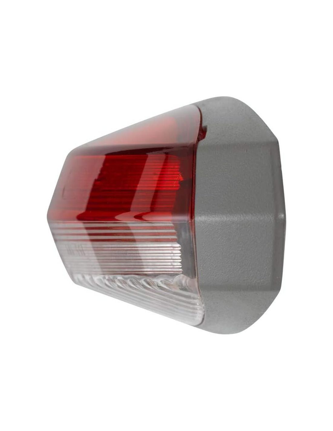 Feu d'encombrement pour caravane Hella 2XS 008 479-061 avec culot gris foncé. Ce modèle est équipé d'ampoules halogènes C5W et compatible 12 V. La lentille est blanche d'un côté et rouge de l'autre.