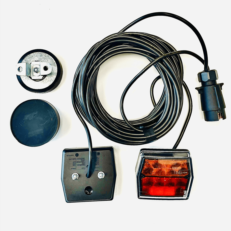Le kit d'éclairage à LED comprend 2 feux à LED avec 4 fonctions, position, frein, clignotant et éclairage de plaque d'immatriculation, un connecteur à 7 broches pour remorque et deux supports avec fixation magnétique pour les feux.