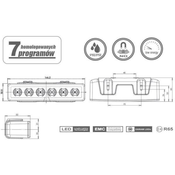 Ce pilote LED a une longueur de 146,5 mm, une hauteur totale de 33,5 mm et une largeur de 50 mm.