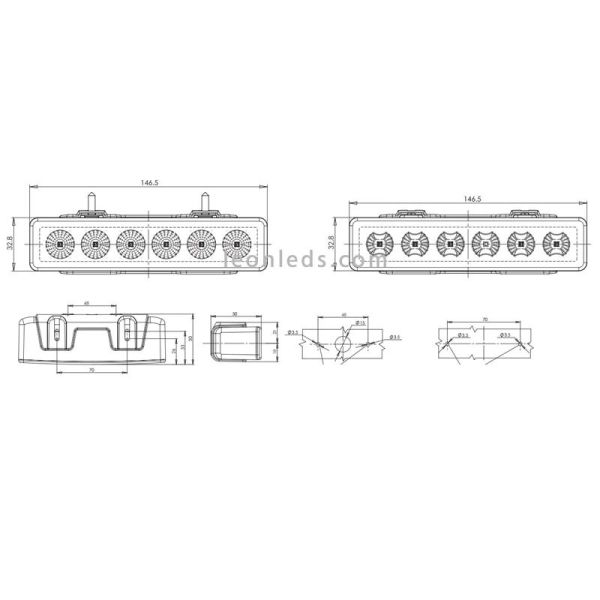 Ce pilote LED a une longueur de 146,5 mm, une hauteur totale de 33,5 mm et une largeur de 50 mm.