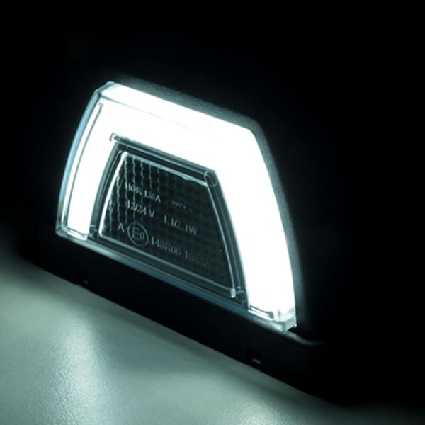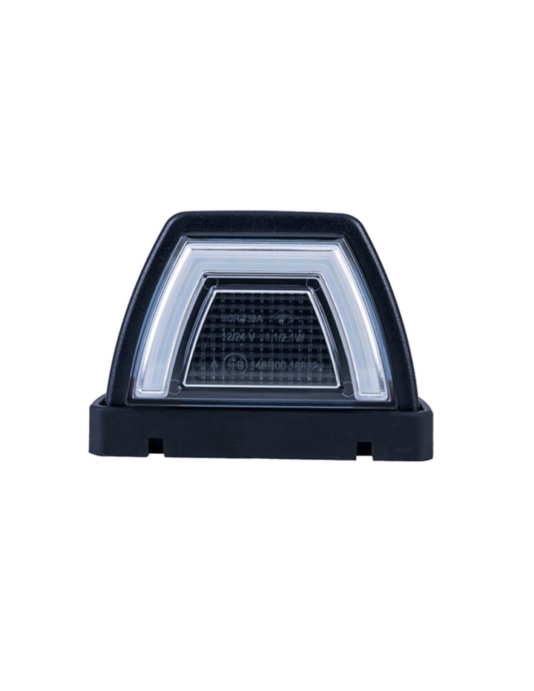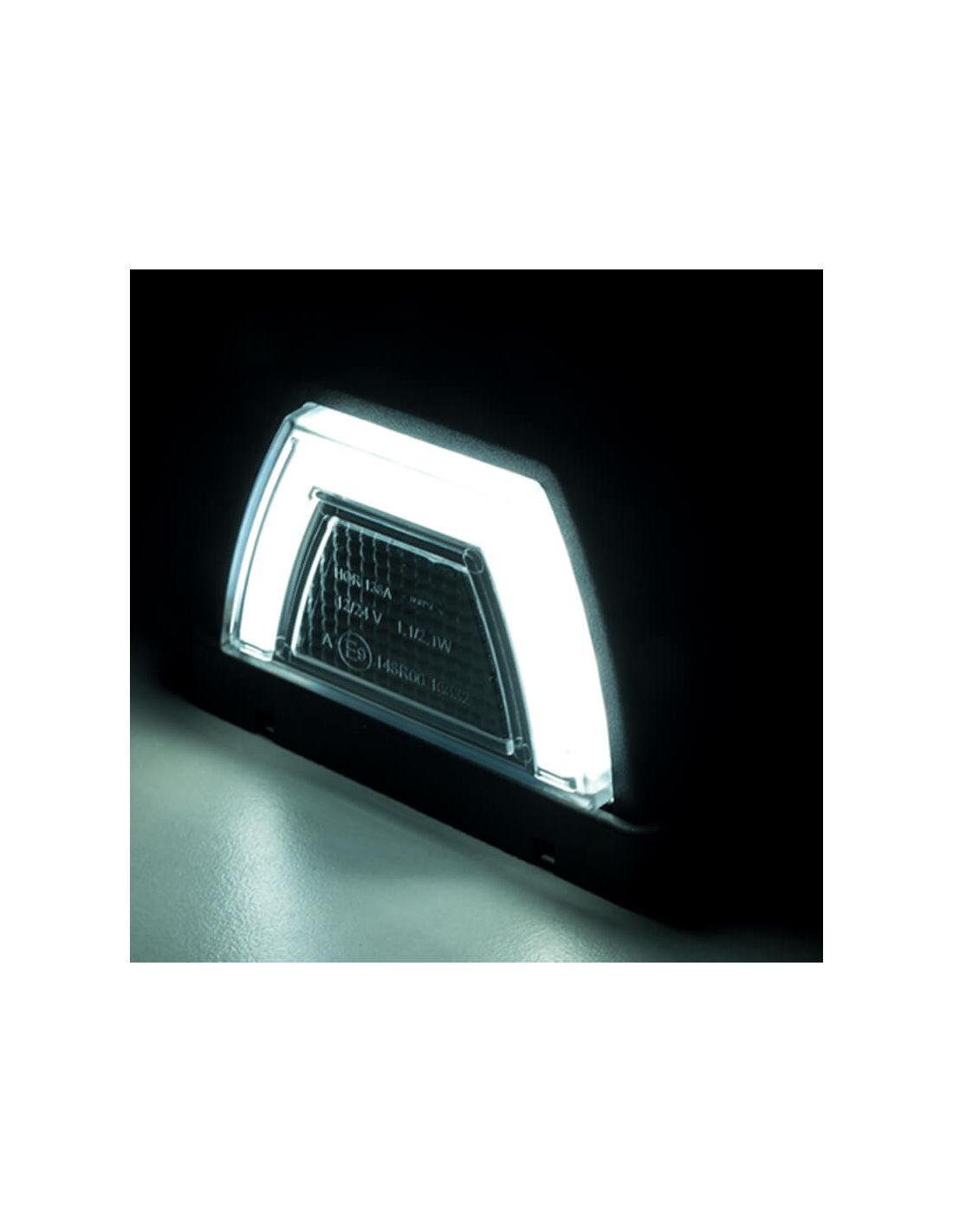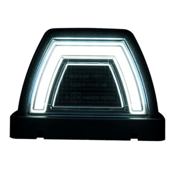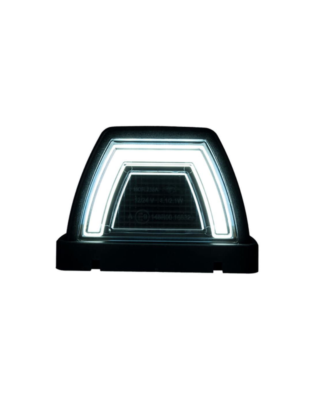 Feu de gabarit à LED blanc avec effet néon angulaire pour toits de cabine. Conception moderne, IP68, étanche à l'eau et à la poussière , avec une faible consommation d'énergie et une compatibilité 12V/24V . Sa lumière homogène et non éblouissante améliore la visibilité et la sécurité du véhicule. Comprend 0,5 mètre de câble avec code d'homologation R10 et A.